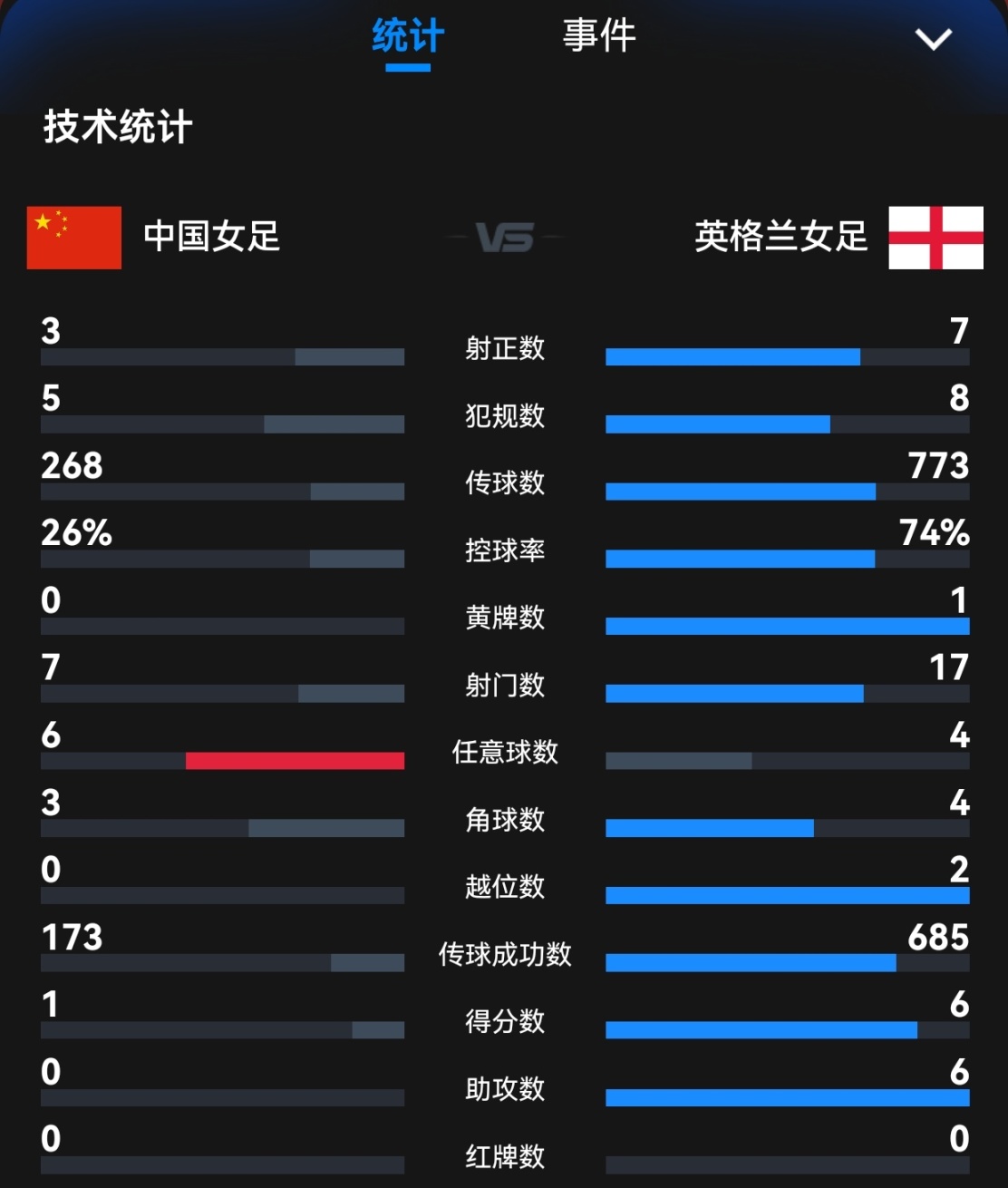 全场比赛结束,中国女足1-6英格兰女足