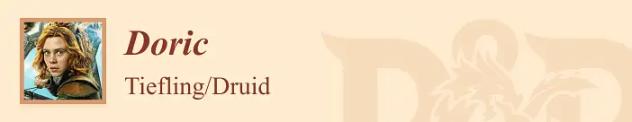 多莉克是一位提夫林族德鲁伊(她真的不是精灵妹子),她能够变身成各种动物,并与自然界沟通。她是一个温柔善良、乐于助人、爱护万物的女孩。她被人类父母遗弃,后被一群木精灵德鲁伊收留并教导她自然之道,信奉了月亮之环德鲁伊流派。多莉克后来加入了埃德金的团队,为他们提供了侦查和治疗的帮助。多莉克对自己的身份感到自卑,常常用面具和斗篷来遮挡自己的面容和尾巴。