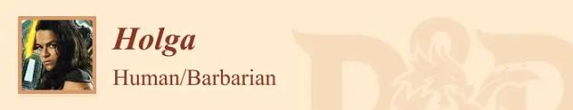 霍尔嘉是一位来自蛮族部落的野蛮人战士,她原本属于麋鹿部落,这个部落曾经诞生过DND史上最有名的英雄之一——沃夫加。但因为她拒绝遵从部落的传统而被放逐。什么原因呢?因为她爱上了一个外来的半身人,但是最终俩人还是离婚了。她流浪在世界上,寻找着自己的归属。她遇到了埃德金,并与他成为了伙伴和朋友。霍尔嘉有着强壮的体魄和无畏的勇气,她喜欢用斧头和拳头来解决问题。她对埃德金的女儿琪拉视如己出,还赠与后者一条能让使用者隐形的吊坠。她对埃德金忠诚不二,即使他做出了错误的决定,她也会陪在他身边。