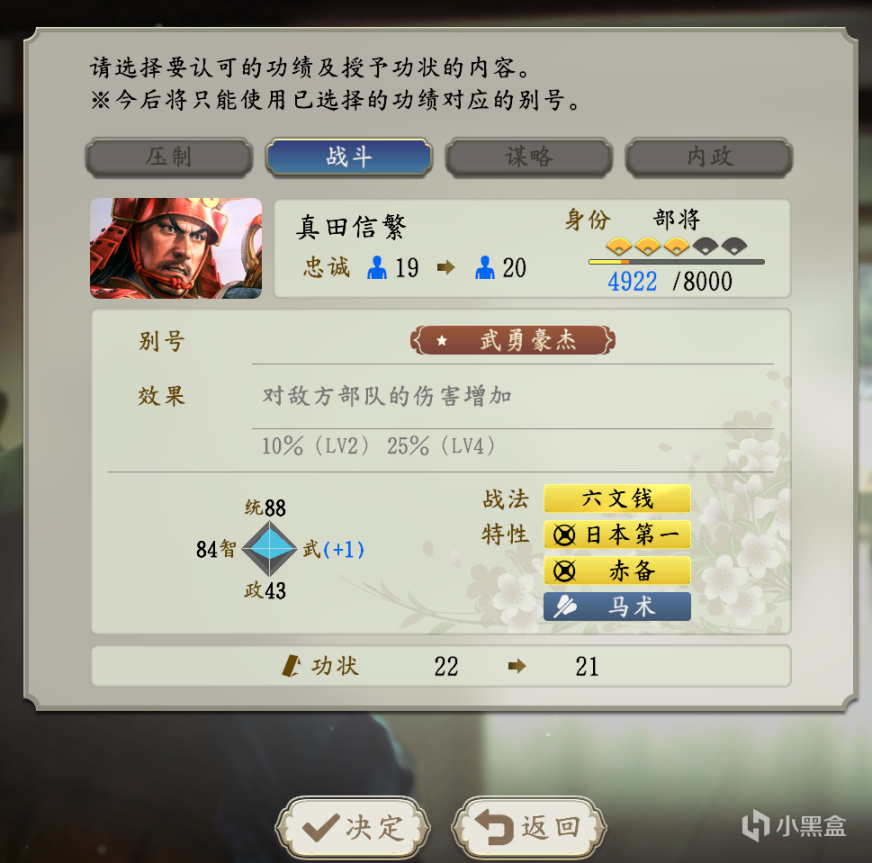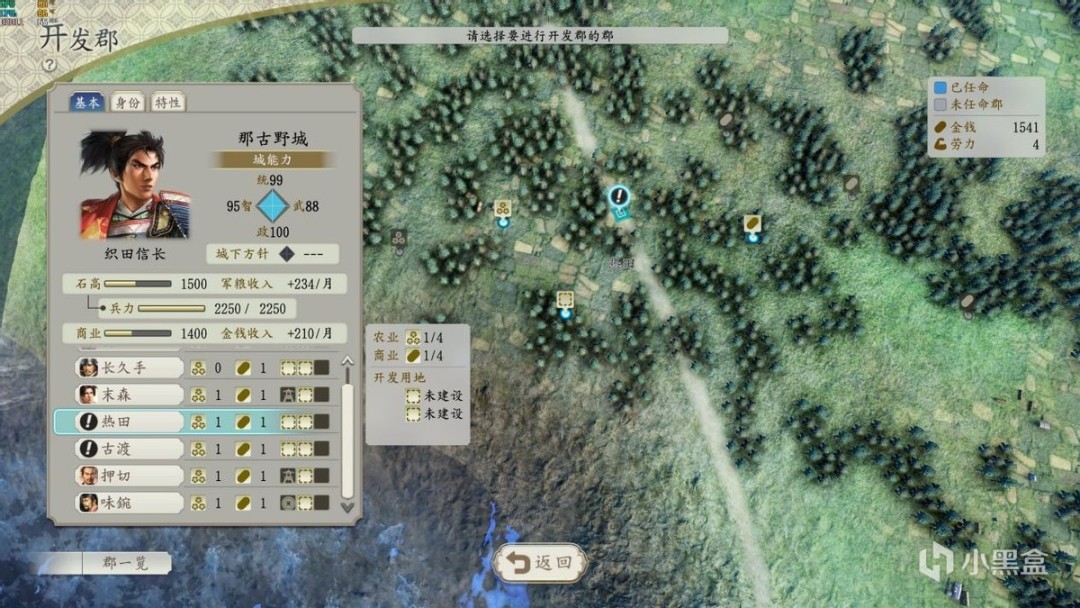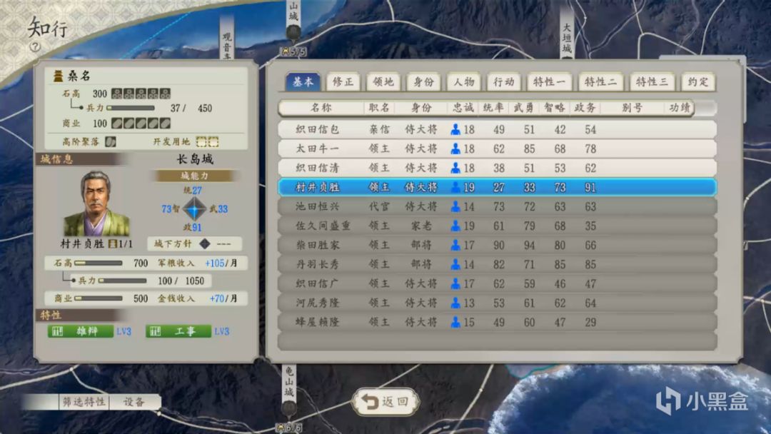 另外,虽然光荣设置了自动批量任命知行的方便功能,但是如果玩家追求高效率发展,在选择地区负责人这个问题上,还是应该做出仔细考量的。其中最重要的就是个人特性,所有武将或多或少拥有自己的特性,特性代表了这个人能带来的效果,也直接决定了他适合的工作岗位。比如与敌方边境接壤的前线城池,适合安排《攻势》柴田胜家这一类的猛将,搭配《计谋》松永久秀这种军师则效果更好;封地数量较多但是百废待兴的城池,则适合以村井贞胜的《工程》、泷川一益的《修缮》这类特性加快重建进度。