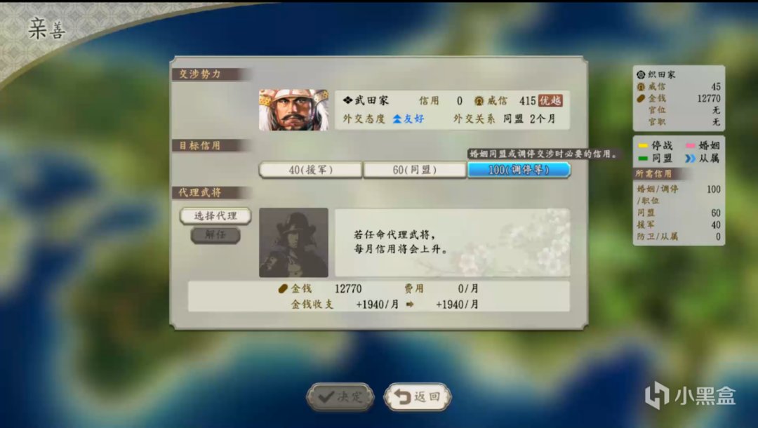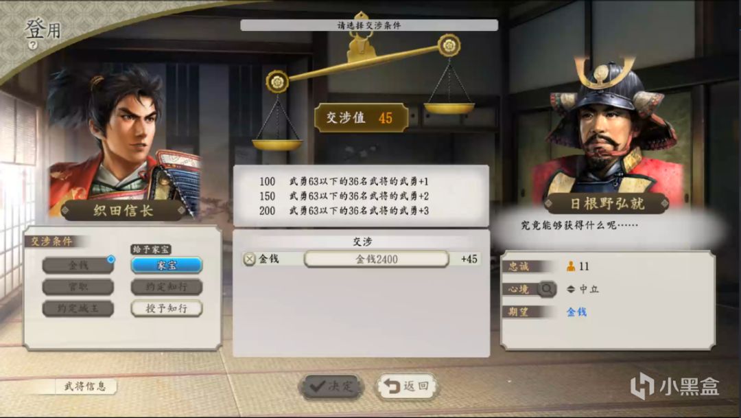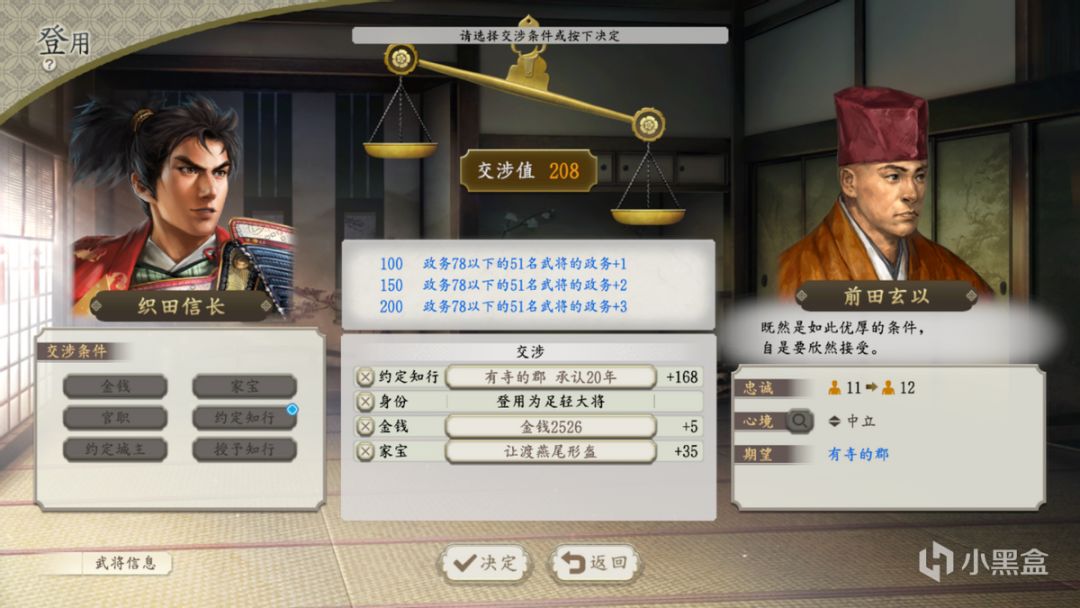 第二种是评定众制度,具体分为家宰和奉行两项职位,可以理解为由你挑选组建的常务委员会。家宰最多可以任命三人,但是本国武将只能占据其中一席,另外两席则必须由从属国的人来担任。家宰根据担任者的特性,会给你的国家同时带来正面与负面效果,比如给你提昇商业收益,但是同时减少农业收成,或者增强你的骑兵能力,但却同时削弱铁炮兵,如何取舍则要看你的打法了。