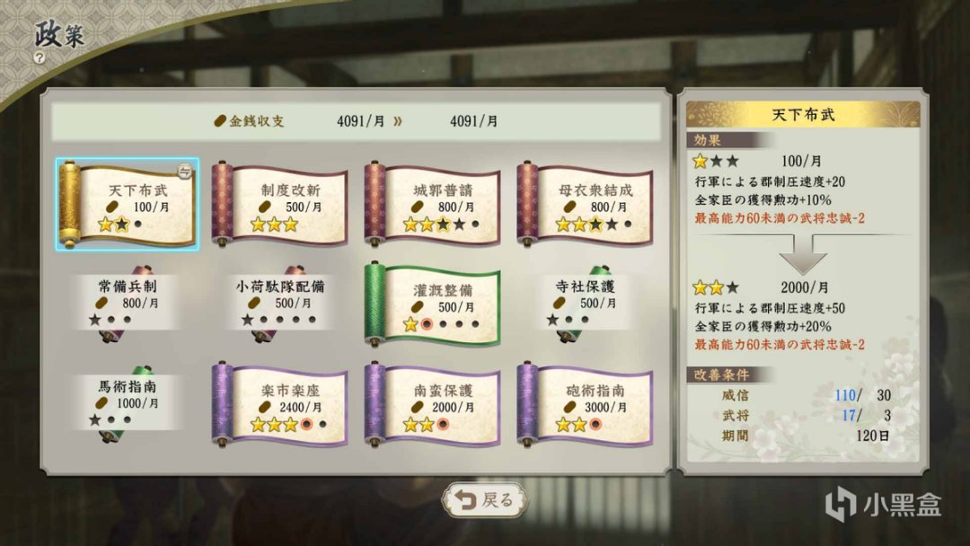 但是对比起斗计用谋,想要治理好国家,行政系统的良好运作才是关键。行政在本作主要体现于两大方面,第一种是政策,可以看作游戏里的科技树,实施政策需要威望指数达标,而且还得付出每月持续的专项费用。许多势力拥有自己的个性政策,比如织田家的《天下布武》可以加快压制封地和家臣晋升的速度,伊达家的《龙骑兵》会大幅度强化骑兵与铁炮的攻击力,北条家的《五条训诫》则因为能够快速恢复被压制地区的生产,让持续扩张能力强得惊人,成为了原版被吐槽最多的超强政策,不得不在这次PK版惨遭削弱。