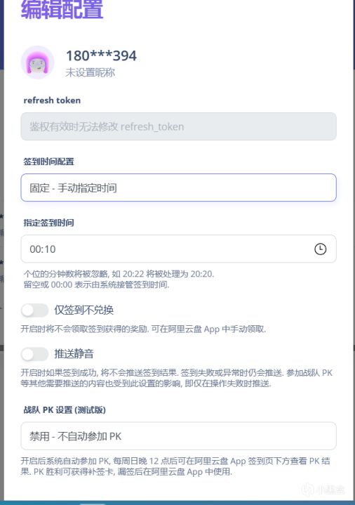 进入网站,使用阿里云客户端进行扫码登陆进行绑定,点击编辑,可以设置自动签到的时间,还有其他功能上面写的也很详细。