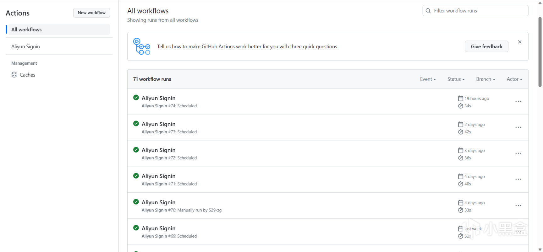 之前我是通过github上的一个大佬的项目进行自动化签到,上面的文档写的非常详细,也只需要几步配置即可,不需要写代码,非常方便,效果如图: