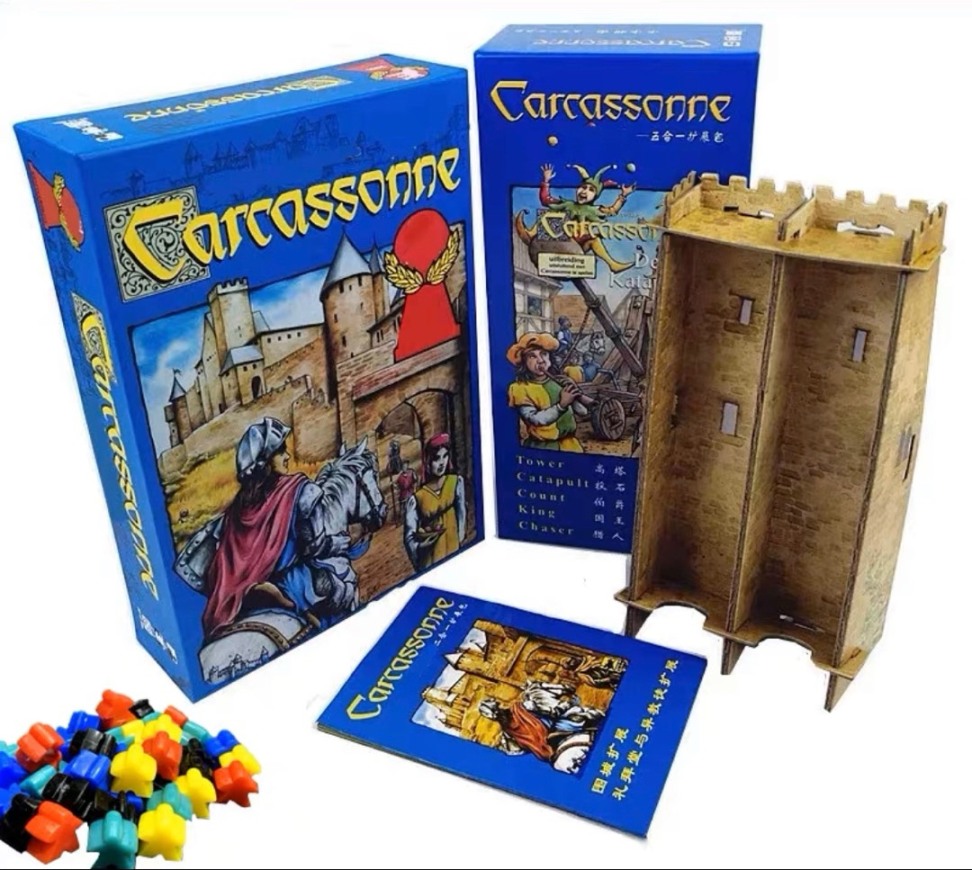 玩法简介:首先玩家要从一叠背面朝上的版图中拿取一片版图,并与桌上已经摆放好的版图相连摆放。将版图摆放好之后,玩家可以选择是否派遣自己的手下到那片版图上,但要遵循相应规则。版图分为:道路、城堡、修道院、草原。不同版图的记分规则不同。当全部版图都被摆放之后,游戏结束,计分最高者获胜。
