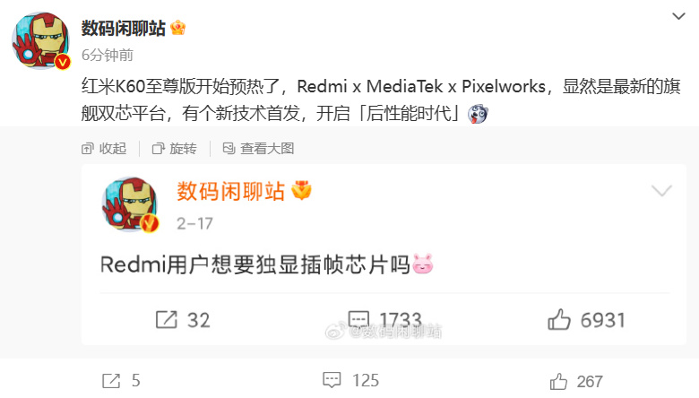 根据目前的多方爆料信息,小米 Redmi 即将推出的新品预计为 Redmi K60 至尊版,有望搭载联发科天玑 9200 旗舰处理器。博主 @数码闲聊站 称,该机还有个新技术首发,大家可以期待一下。