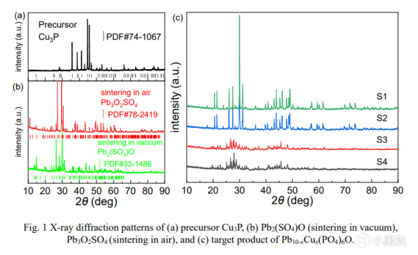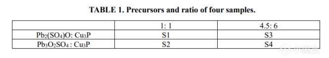 前驱物磷化亚铜Cu3P和黄铅矿Pb2(SO4)O,以及所有合成产物的X射线衍射图样(XRD)都显示在下图中,左边测量的是两种前驱物,右边测量的是团队做出的四个样品,对比四种样品S1、S2、S3和S4,其中S1 和 S2 的粉末 XRD 图样显示出相同的峰位,S3 和 S4 的粉末 XRD 图样也显示出相同的峰位。