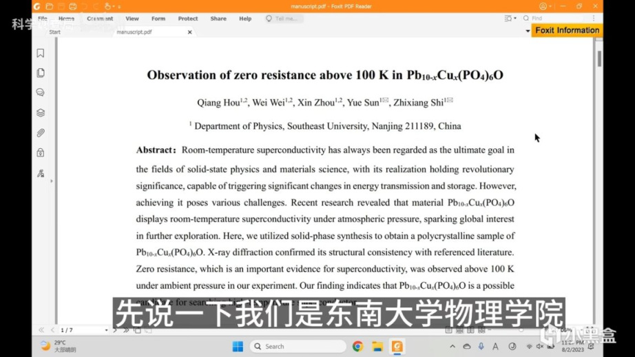 今天凌晨,东南大学物理学教授孙悦组,在B站发布视频,称LK-99在110K(-163°C)温度以下的常压情况下电阻率跳变,观测到了零电阻现象,同时将论文发布到arXiv上占坑,虽然这个温度离室温还有一段距离,团队认为这可能是一种候选的高温超导体,目前东南大学并没有验证到制备的材料有明显的抗磁性,具体情况还需进一步测量。