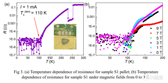 下面是最震撼的零电阻测试,由于样品易碎,很难将其切割成规则形状,所以对不规则的LK-99进行电学测量,下面左图中显示了样品 S1在 110 K 时观察到明显的零电阻特征,其他一些样品表现出的部分性质也基本与原团队结果一致。