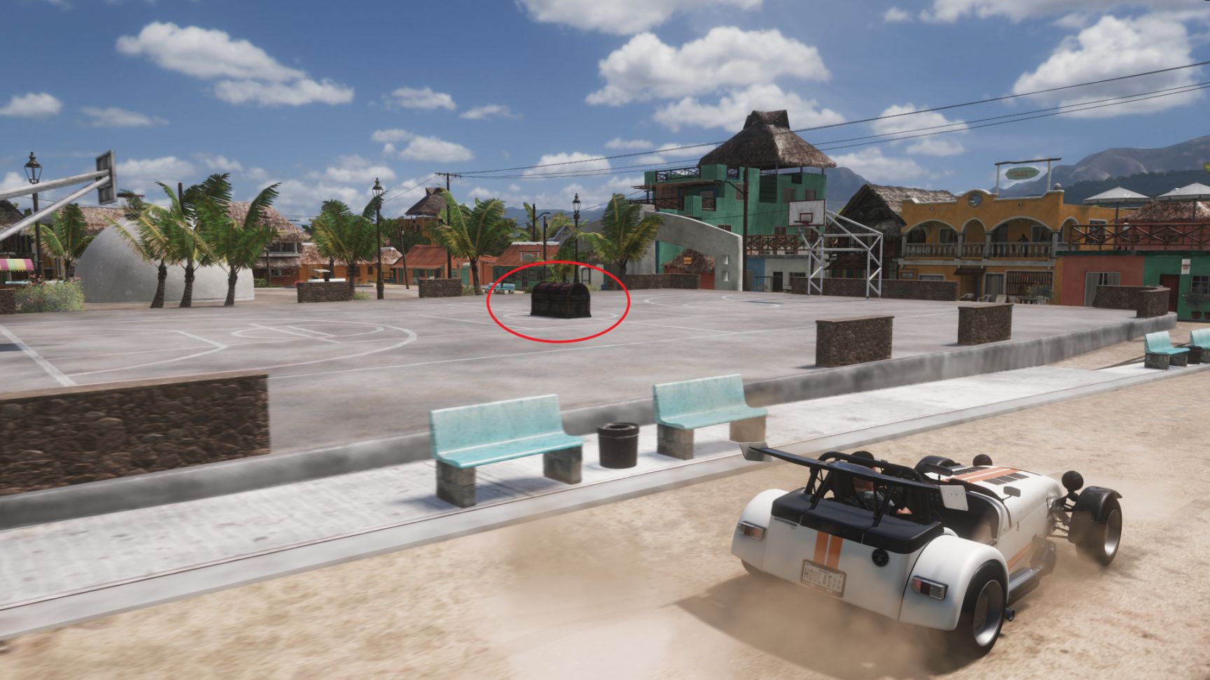 宝箱被摆放在居民区内的一处篮球场中央,驱车入内破坏箱子即可。