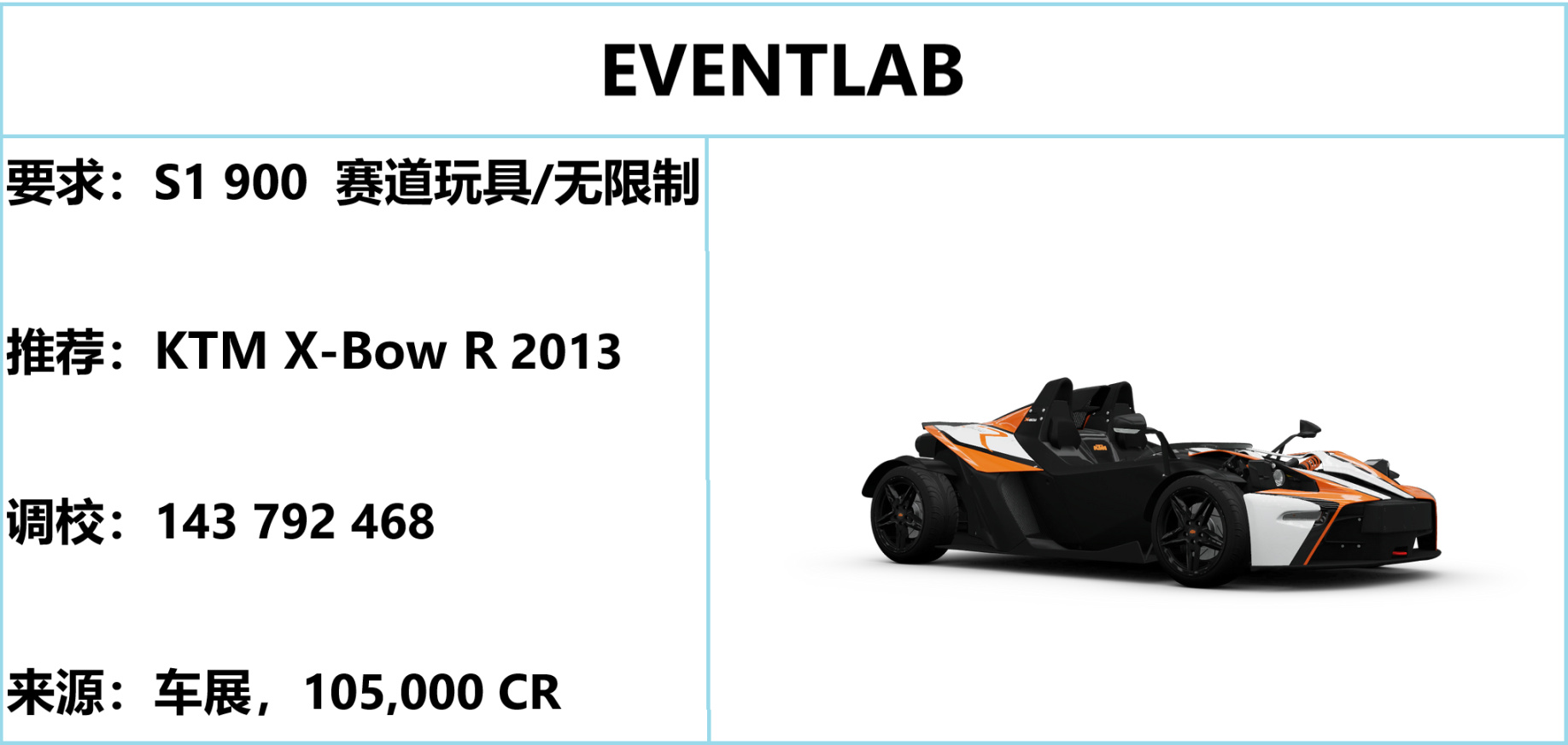 EVENTLAB 是单人体验的蓝图,无难度可言,只需开符合标准的车即可。
