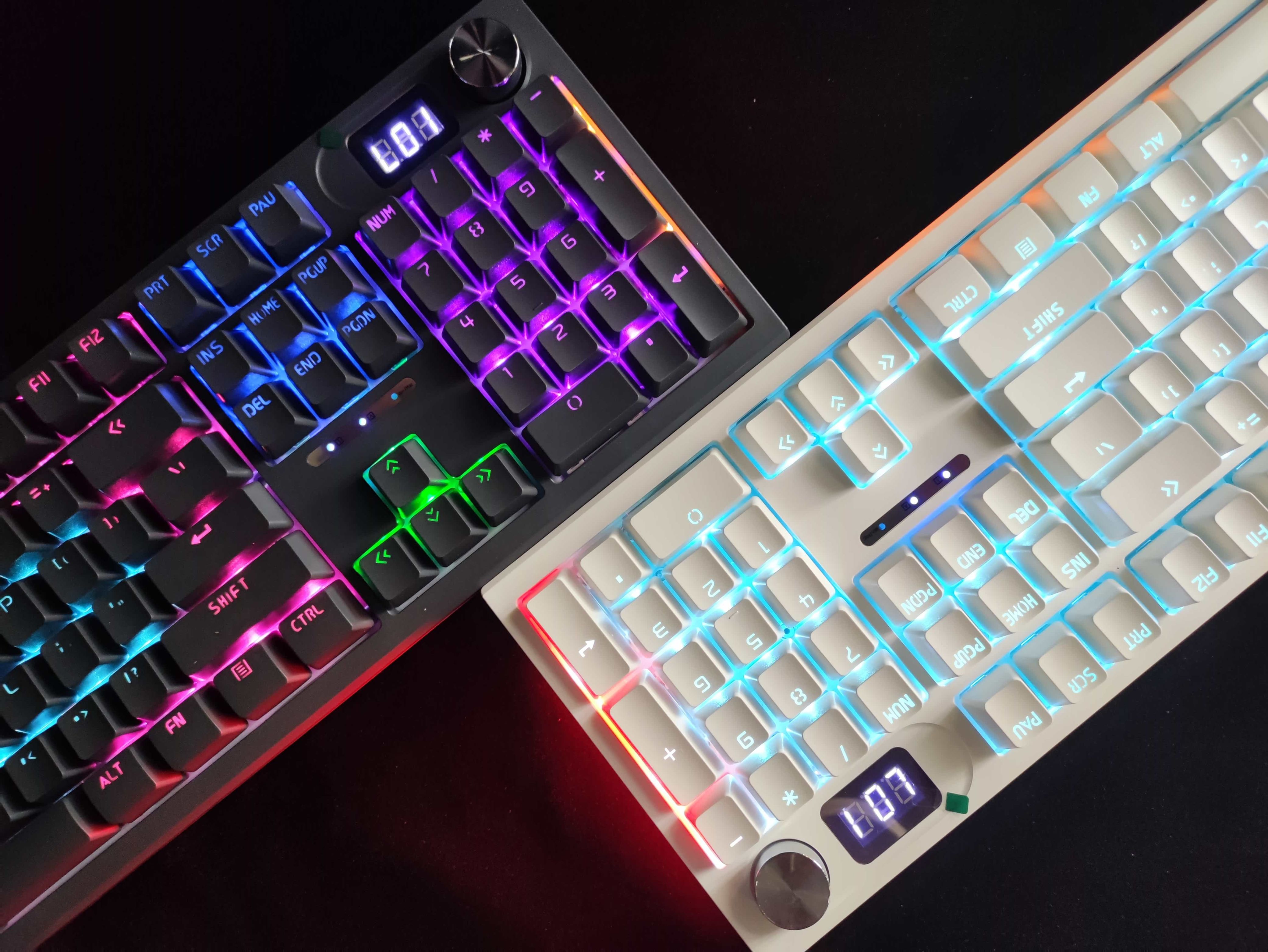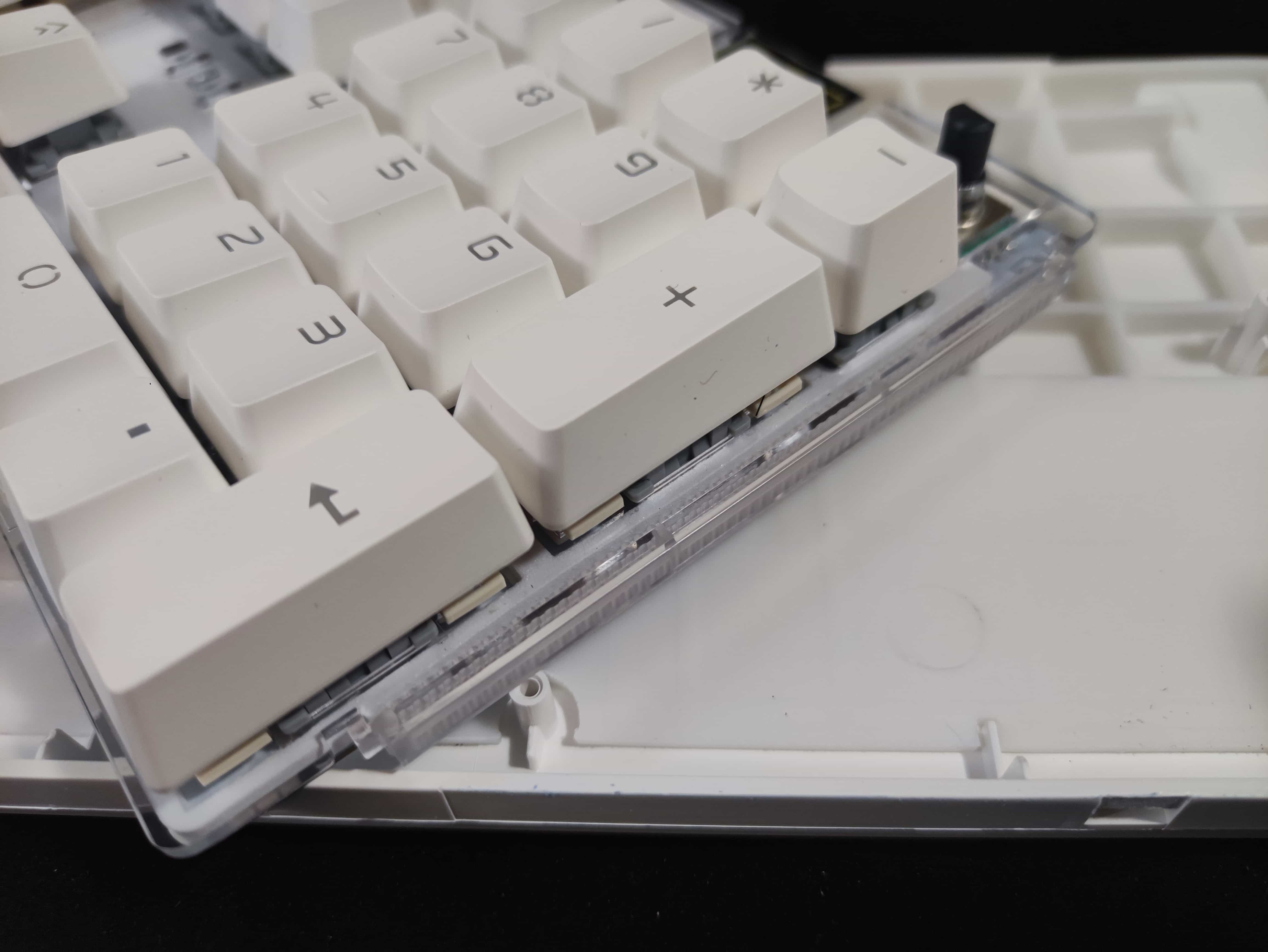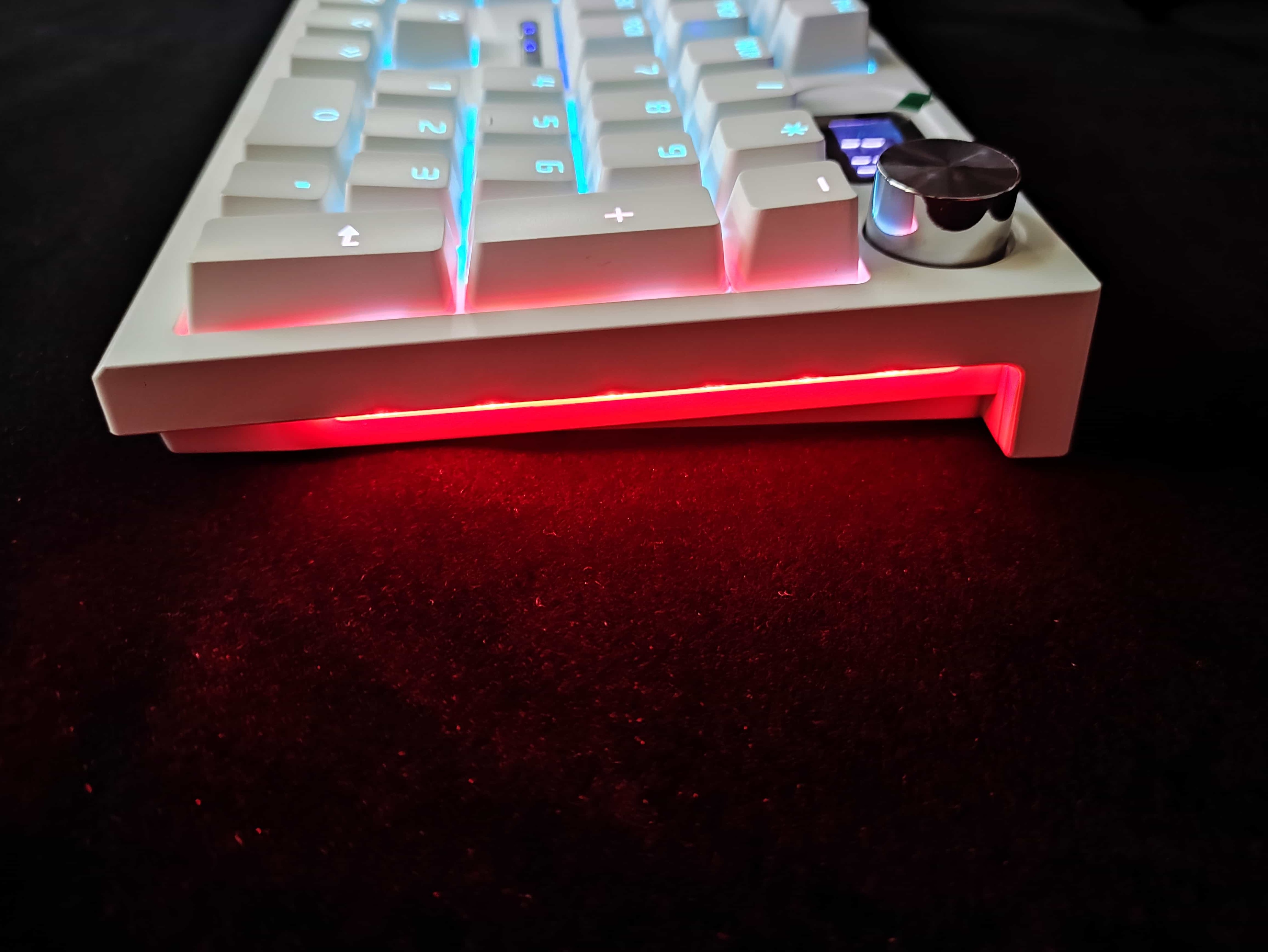 键盘的左右两边有两个灯条,键盘上的灯光*可以通过旋钮按压调节灯光效果,单色灯光,可惜没有RGB(三模有)。