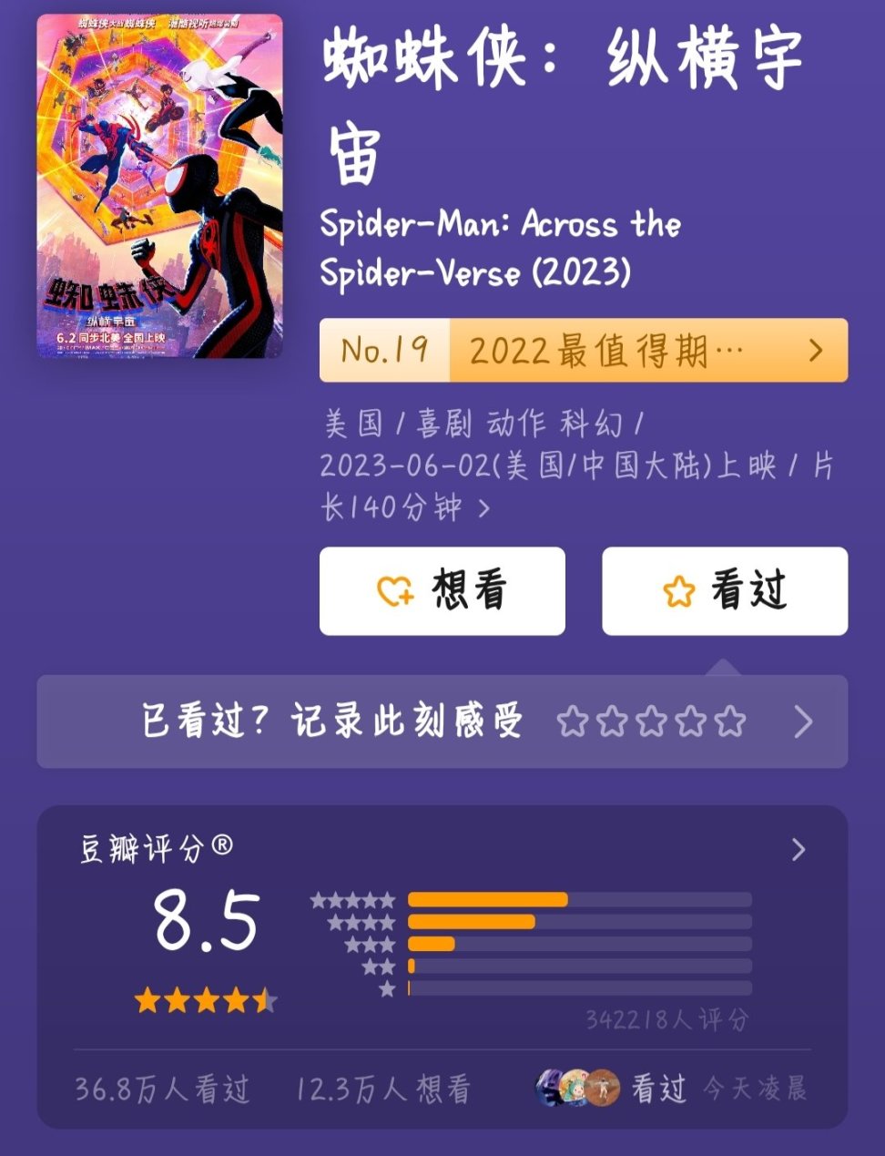 《蜘蛛俠:縱橫宇宙》 於 6 月 2 日在中國內地、北美上映,隨後延長放映至 8 月 1 日!目前豆瓣評分8.5!