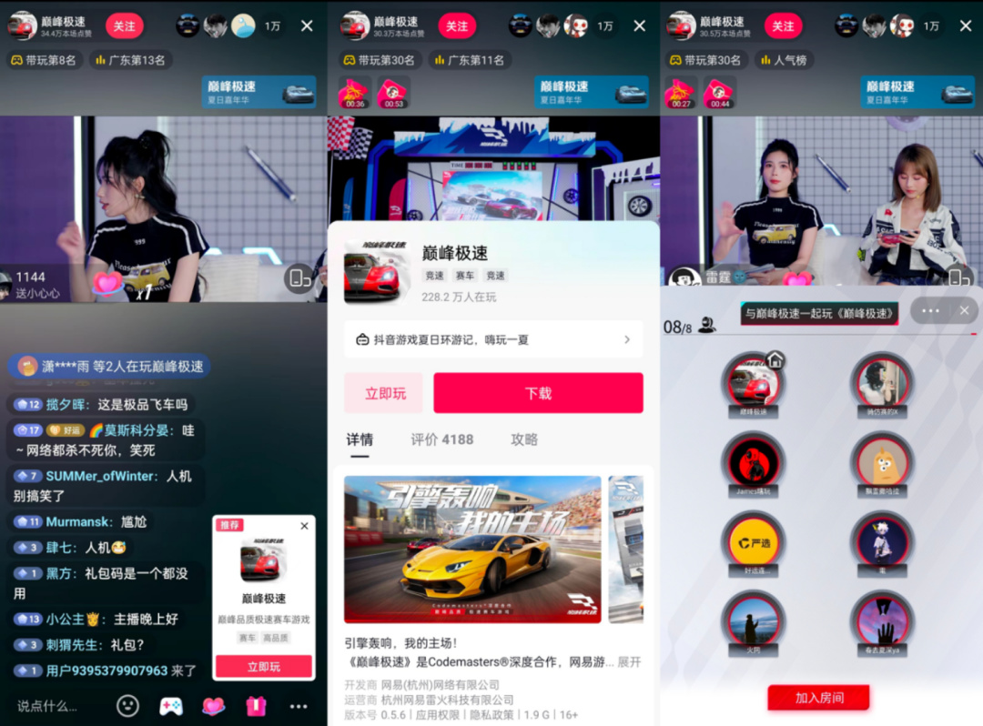 以《巔峯極速》的直播爲例,他們邀請了陳卓璇、張嘉元兩位年輕藝人——他們同時也是明星車手。在被吸引進來後,無論是他們的粉絲、對賽車感興趣的觀衆,還是想要一起玩的玩家,都可以通過直播間下方的「立即玩」直接加入主播的房間,開啓競速體驗。