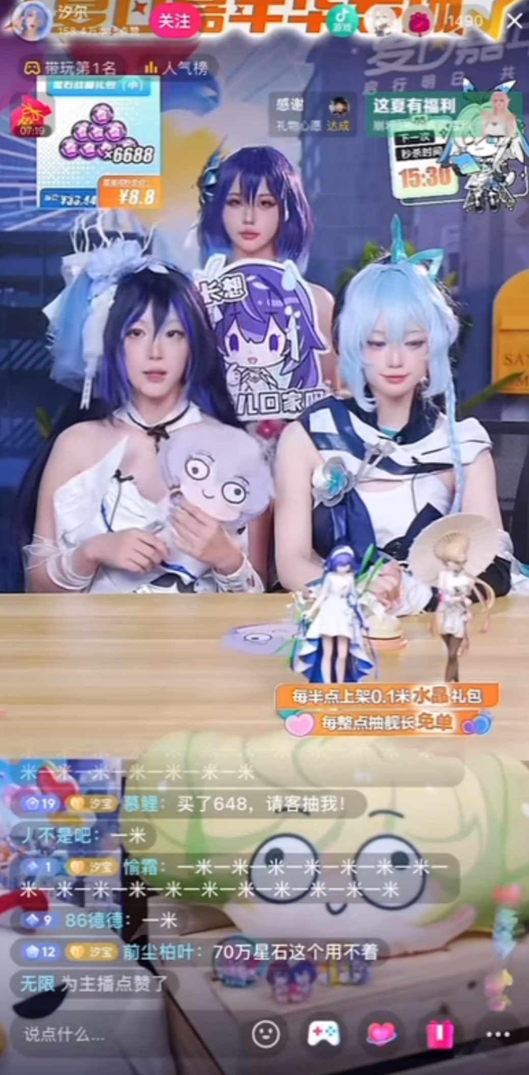 以《崩壞3》夏日嘉年華爲例,米哈遊算是把直播帶貨玩明白了——在不同的會場中,有大偉哥親自下場送福利,也有Coser講解帶貨。在他們的助推之下,一些低價秒殺的禮包直接被玩家們搶瘋了,最終直播間上升到了帶玩榜第一名,通過小手柄成交的單數也超過13000筆。