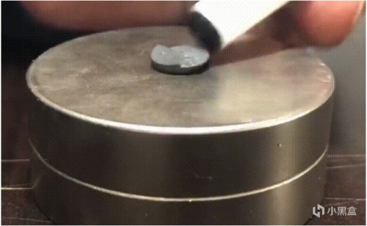 在視頻中,UP主拿出了一個釹鐵硼磁體, 放在小黑點材料下面,觀察材料的反應。
