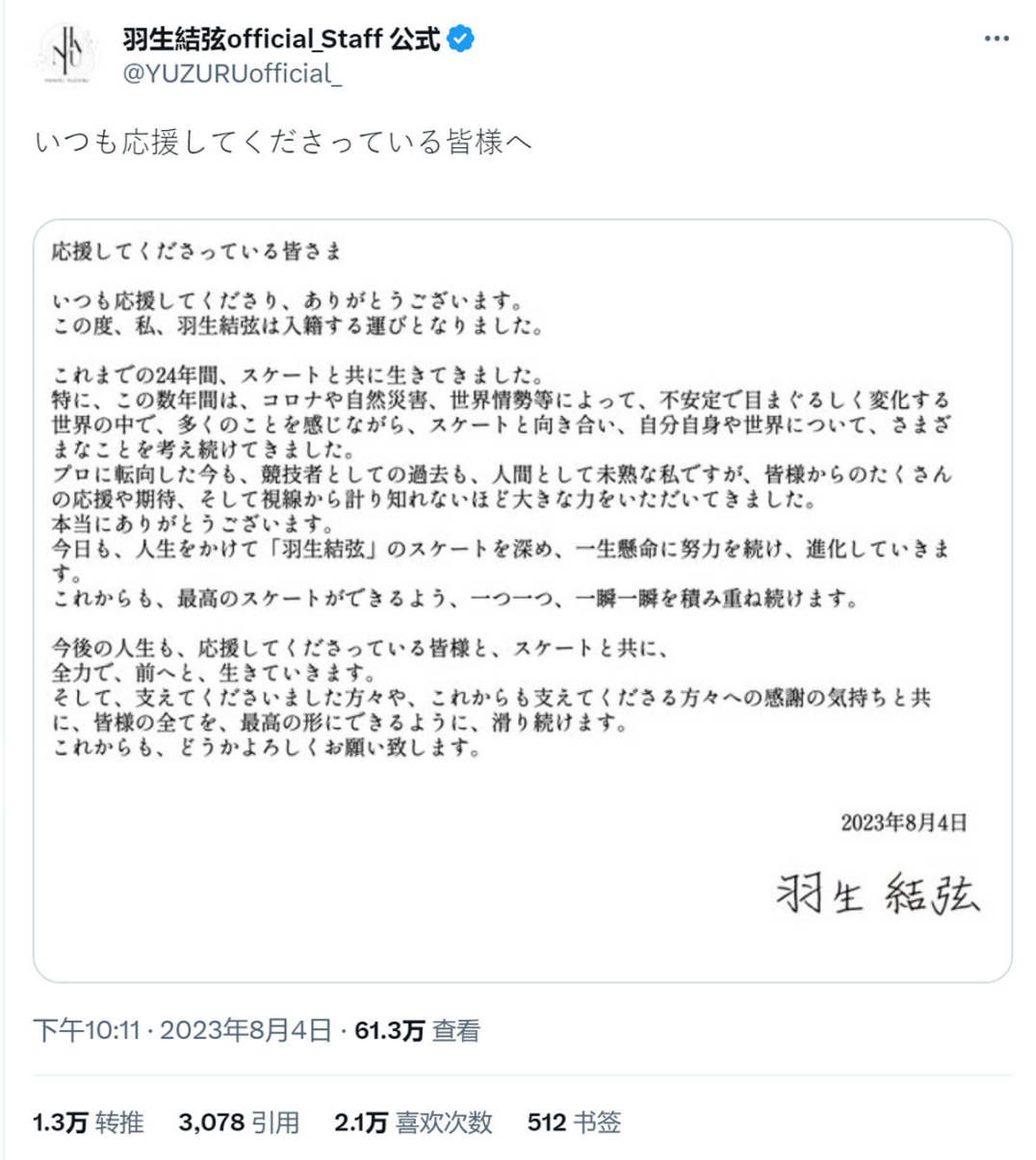 8月4日晚,羽生结弦通过官方账号发布推文宣布了自己的结婚消息,并称:“在今后的人生中,我也会和支持我的大家一起,和滑冰一起,全力前进。”
