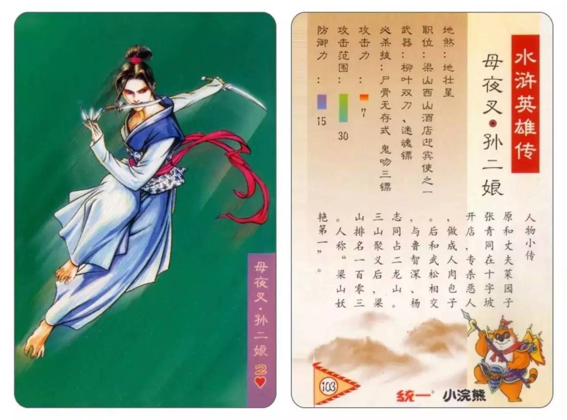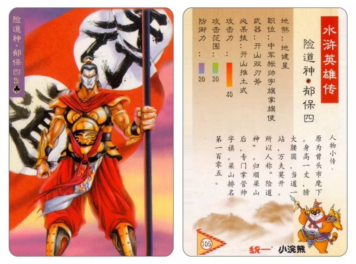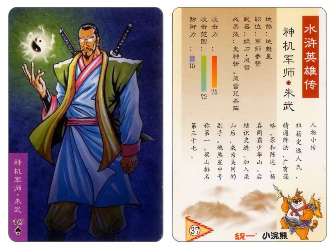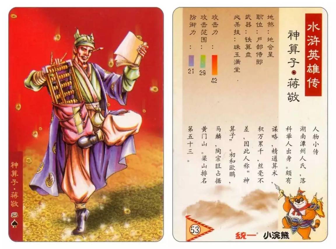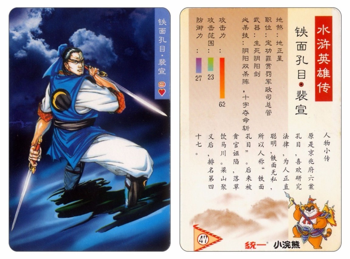 在1999年年末~2001年初统一集团名下的小浣熊干脆面推出水浒卡108张,加上6张恶人,包括各种闪卡,大卡、中卡等.