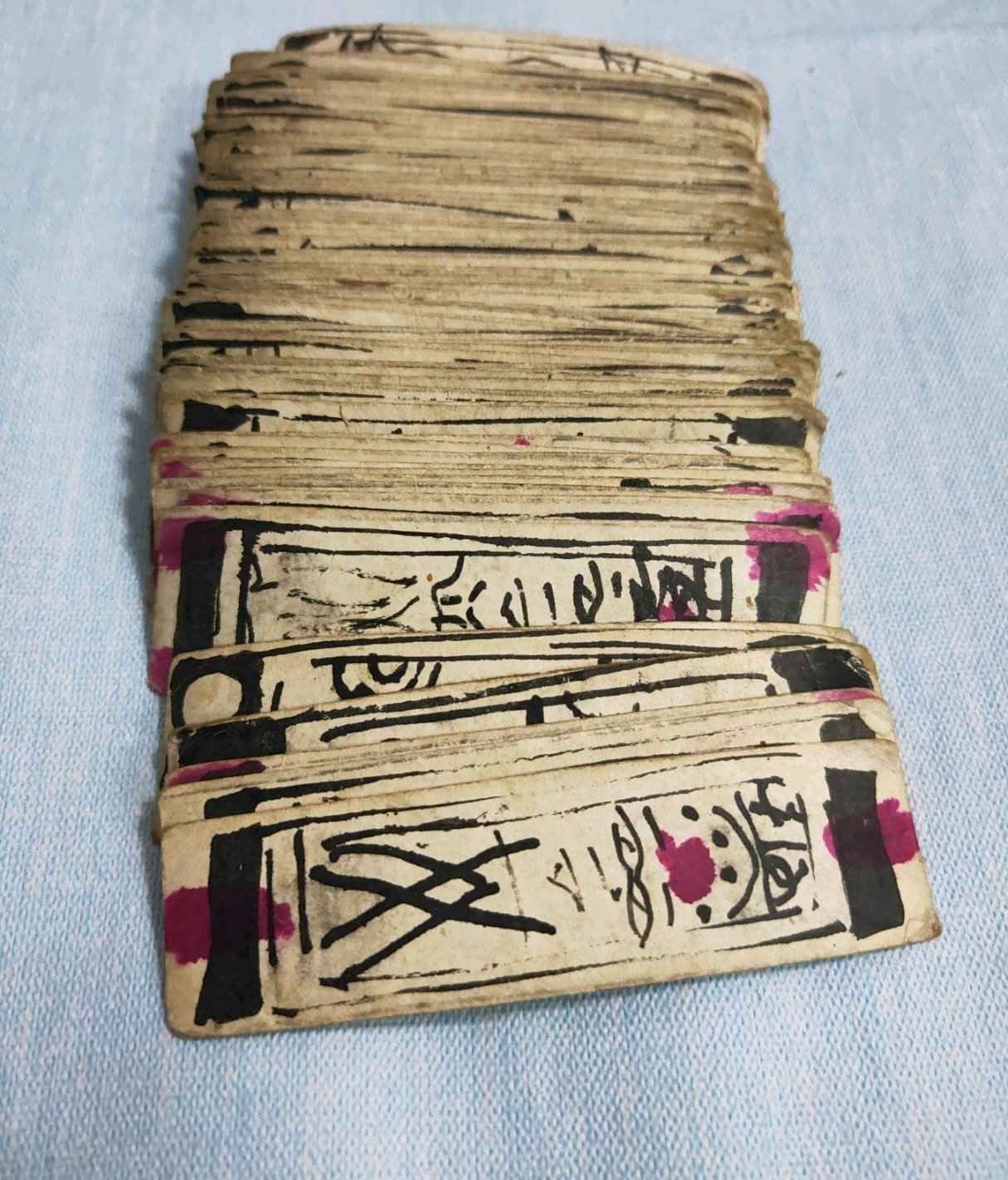 这种纸牌很长,所以慢慢有人在上面绘画和配文.到了明清时期,随着《水浒传》的盛行,也有画上水浒人物的纸牌.