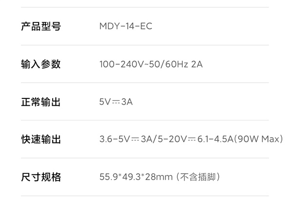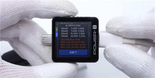 另外,充电器具备PD 3.0快充的5V3A、9V3A、15V3A、20V3.25A四组固定电压档位,以及小米3.6-11V6.1A、3.6-20V4A、3.6-20V4.5A三组私有PPS电压档位。