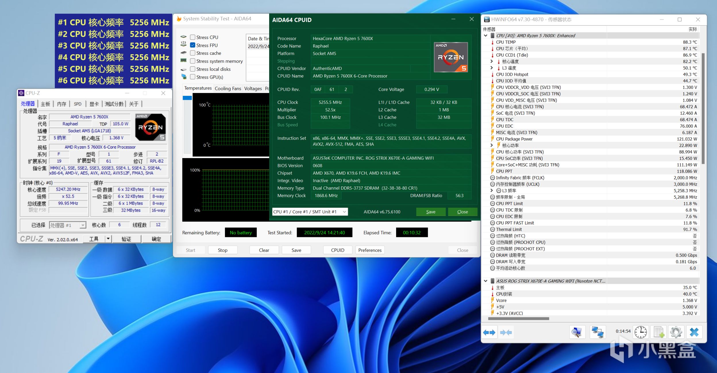 AIDA64單烤FPU項目,Ryzen 5 7600X能夠長時間穩定全核5.25GHz,CPU Package功耗爲120W左右,CPU封裝溫度爲88℃