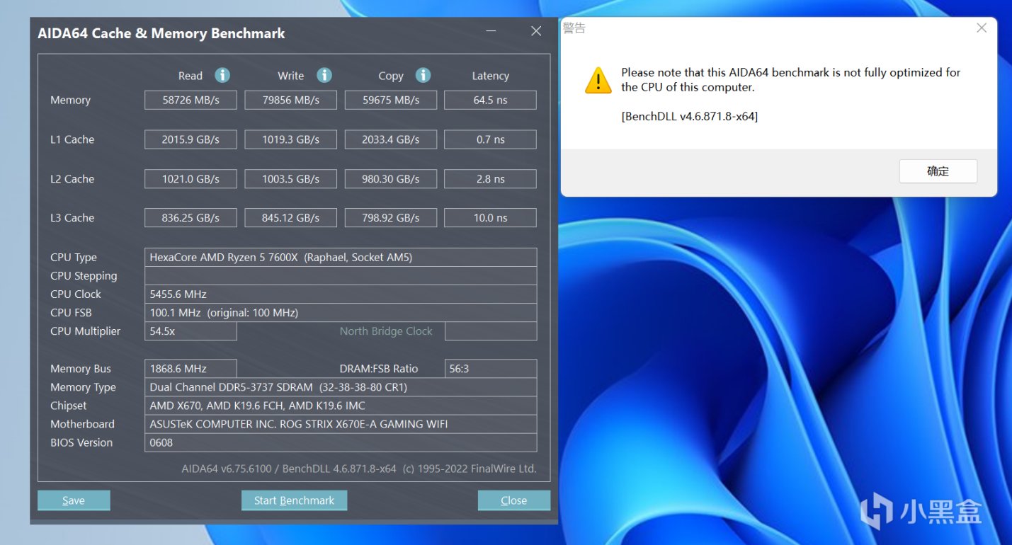 目前最新版本的AIDA64雖然宣稱支持Ryzen 7000處理器,但是運行內存和緩存測試會彈錯誤框,後續等更新再測試下FLCK極限和內存超頻吧,內存延遲應該是準確的,64.5ns就是FLCK同頻後的結果,表現略優於十二代酷睿,基本很接近使用DDR4 3600組合的Ryzen 5000了。