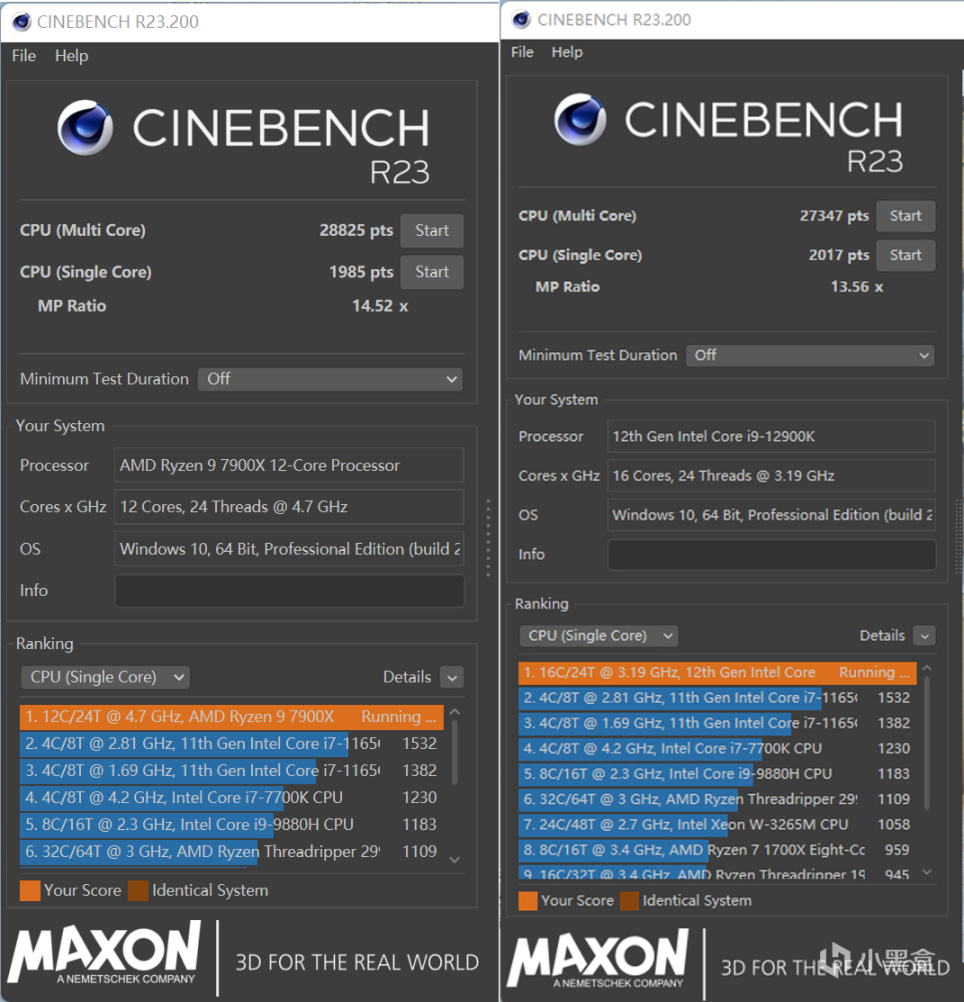 CINEBENCH R23測試,Ryzen 9 7900X單核1985 pts,多核28825 pts,Core i9-12900K單核2017 pts,多核27347 pts