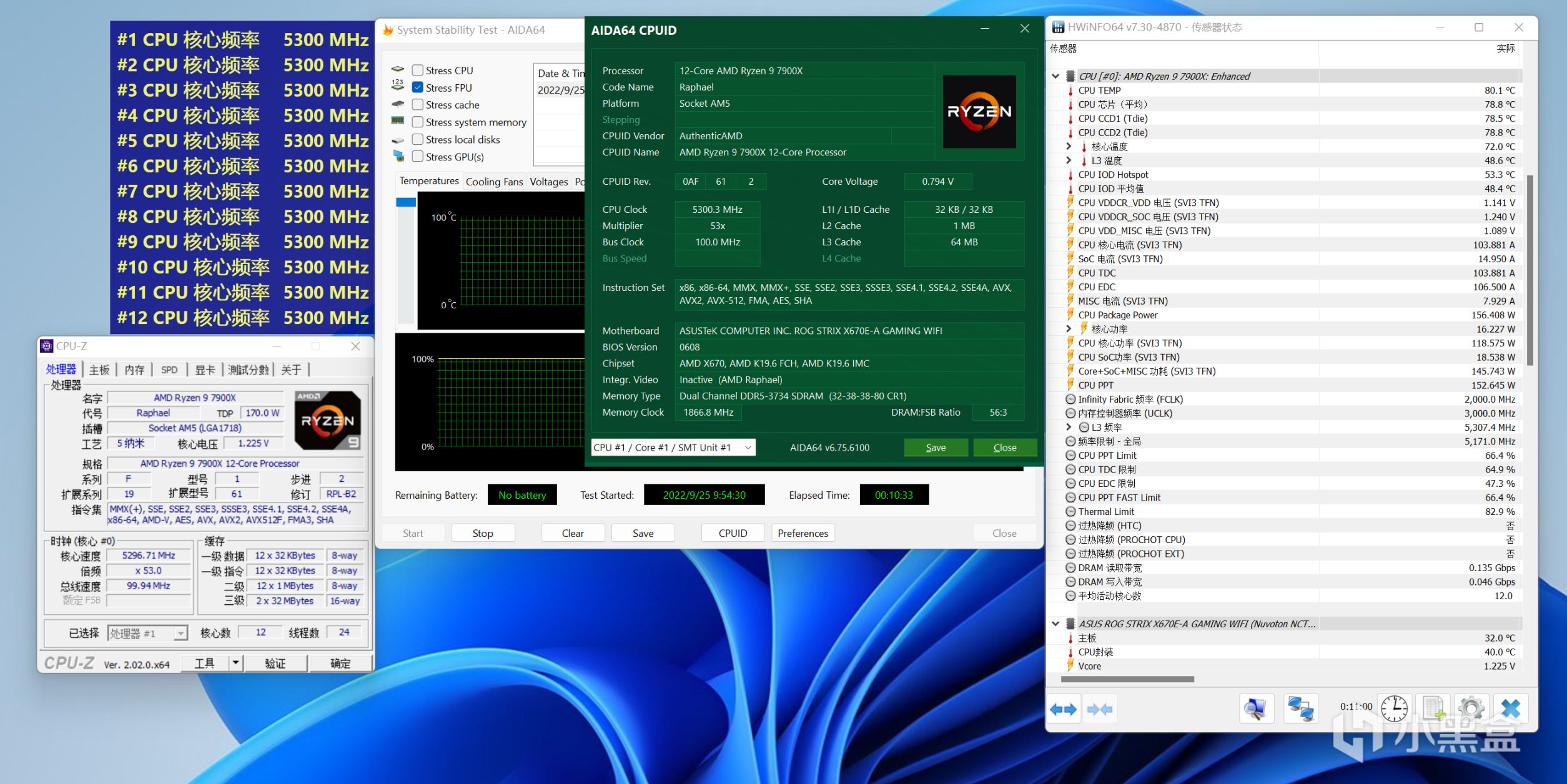 AIDA64單烤FPU項目,Ryzen 9 7900X穩定超頻至全核5.3GHz,CPU Package功耗爲156W左右,CPU封裝溫度爲80℃,核心電壓降至1.225V