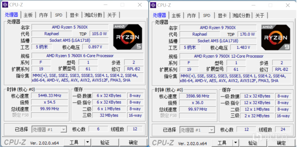最新版本的CPU-Z已經可以成功識別到Ryzen 7000,表面參數來看,除了頻率提升明顯和AVX512指令集支持以外,二級緩存相較於Ryzen 5000系列翻倍了,尤其是Ryzen 5 7600X都能跨級超越Ryzen 7 5700X,全程測試默認使用PBO AUTO,打開華碩D.O.C.P內存超頻技術達成DDR5 6000 16GBX2雙通道,而Ryzen 5000則是DDR4 3600 8GBX2標準配置。
