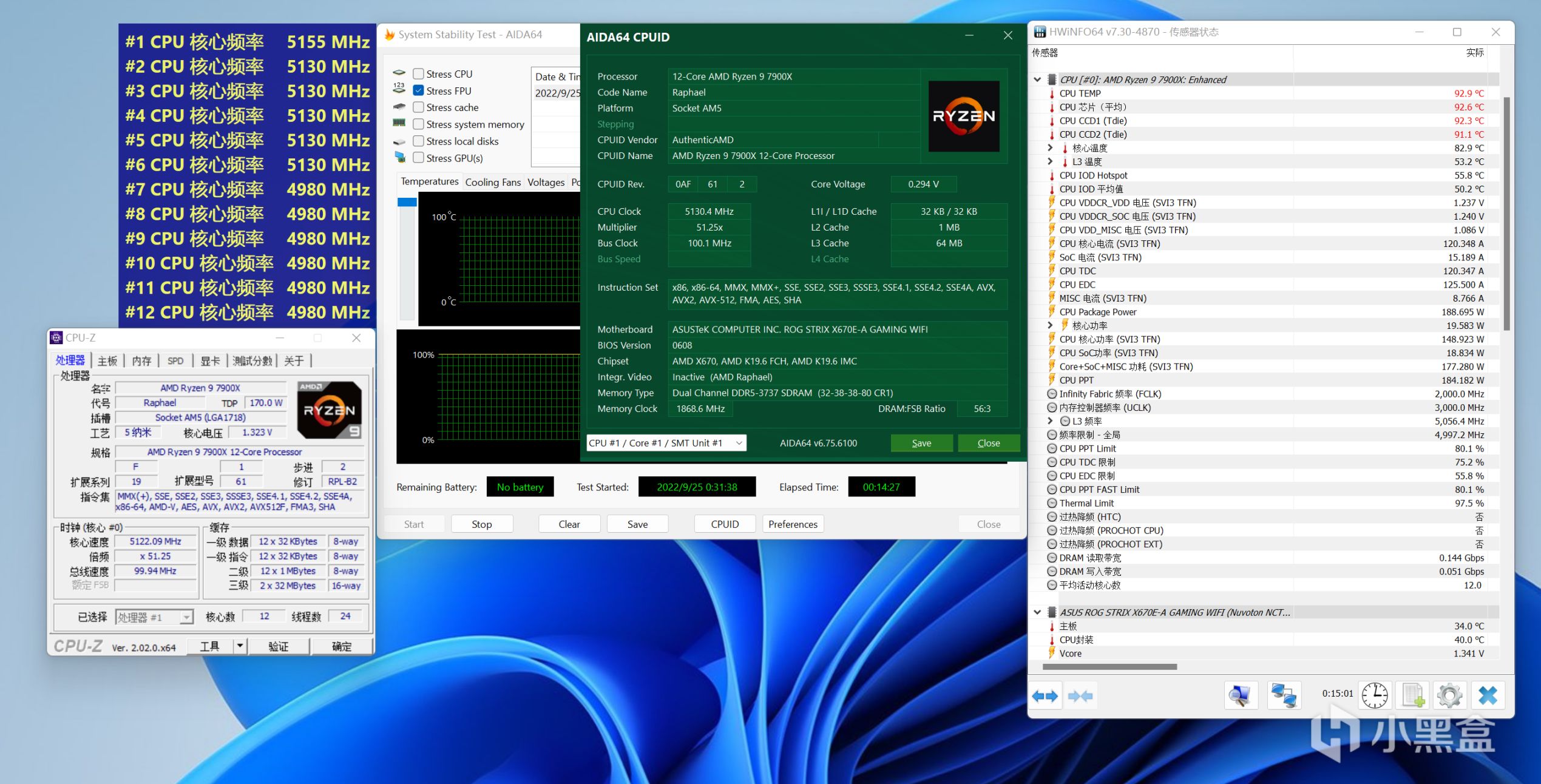 AIDA64單烤FPU項目,Ryzen 9 7900X六個核心5.15Ghz,另外六個核心5.0GHz,CPU Package功耗爲188W左右,CPU封裝溫度爲93℃