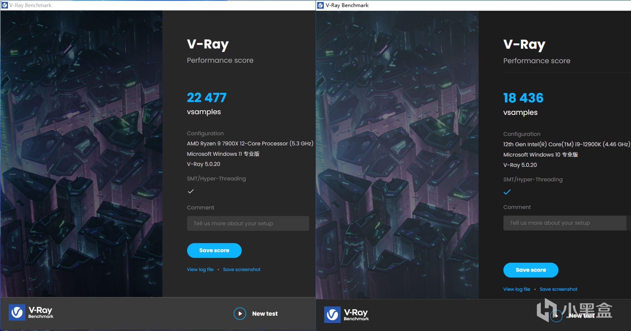 V-RAY測試,Ryzen 9 7900X得分22477,Core i9-12900K得分18436