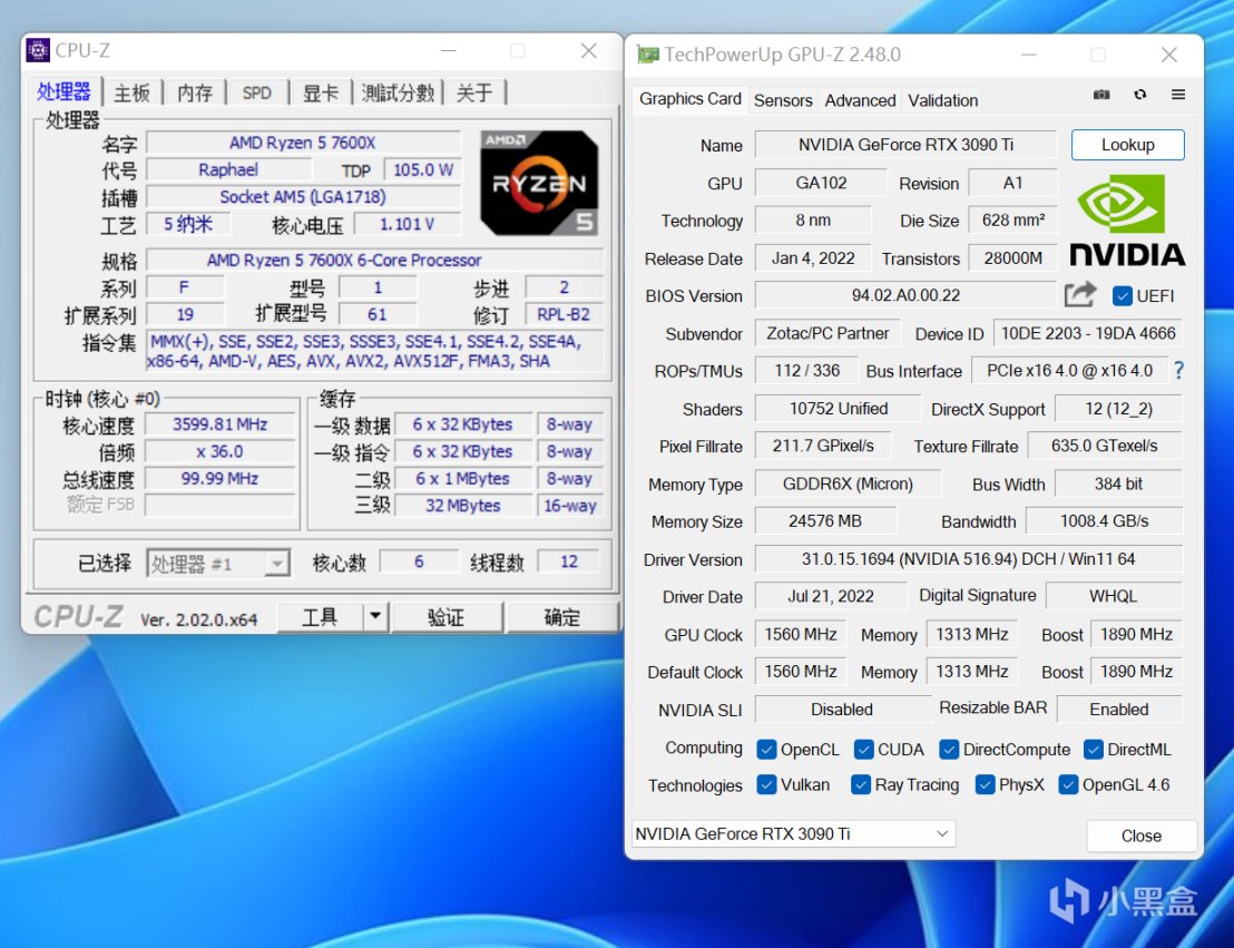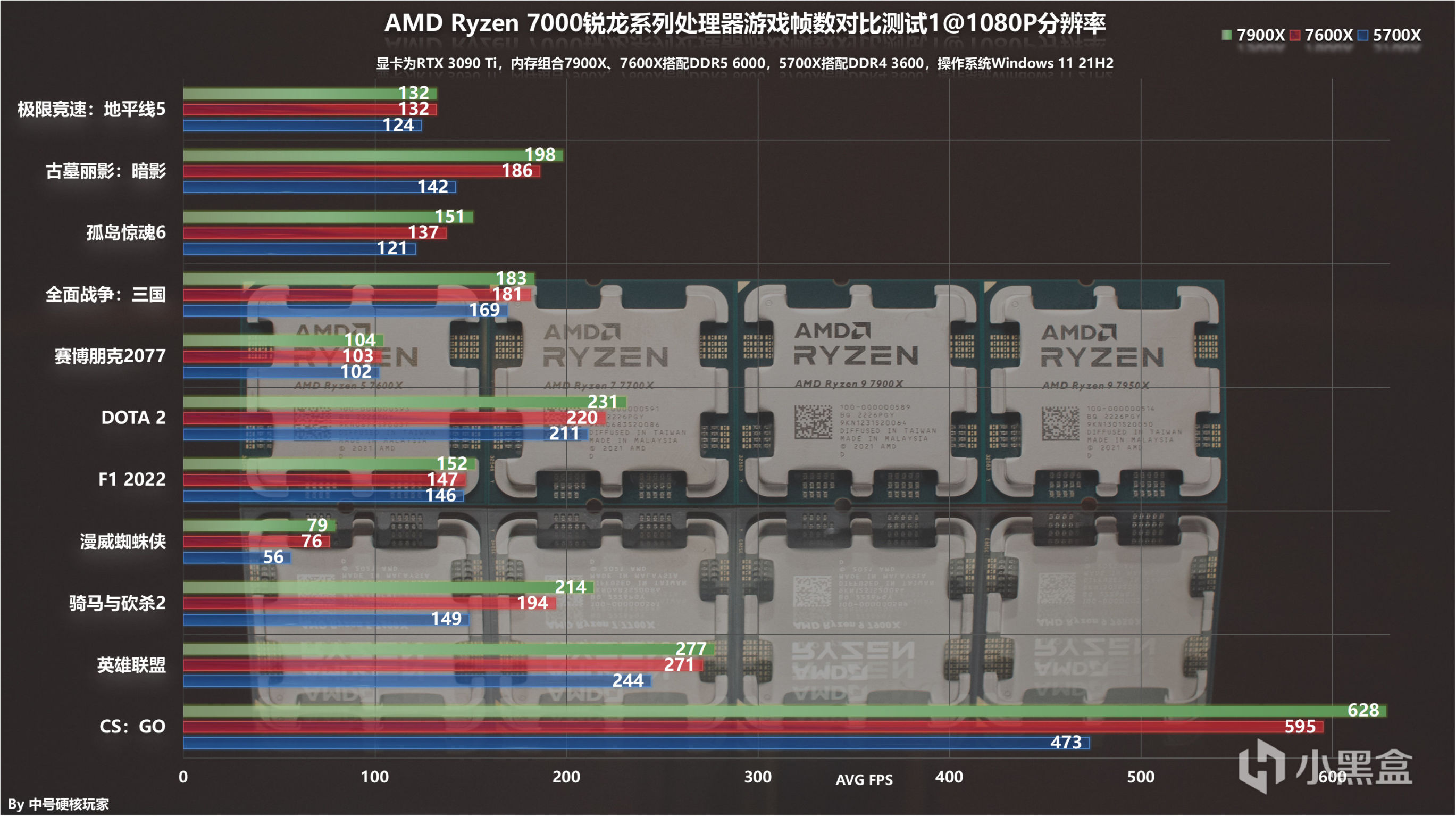 手頭上沒有合適的對標CPU,只加入一款上一代的Ryzen 7 5700X作爲對比參考(基本可看作5800X),另外會引入兩組i9-12900K的測試數據以便對比Ryzen 9 7900X,使用的是Windows 11 21H2操作系統和最新版本NVIDIA驅動516.94 WHQL顯卡驅動,安裝AMD內測版芯片組驅動,並打開Resizable BAR功能以便最大化RTX 3090 Ti顯卡性能。