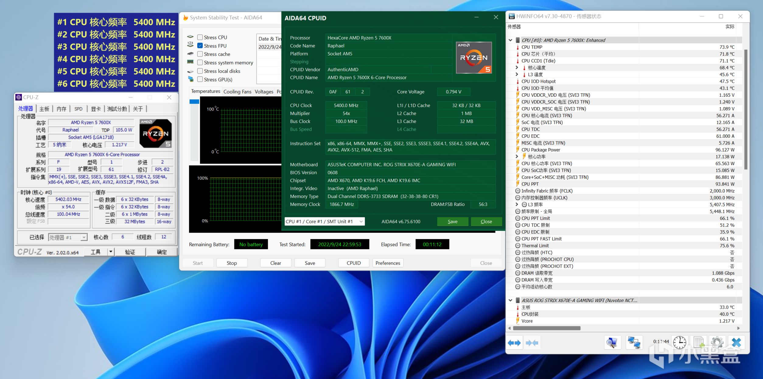 AIDA64單烤FPU項目,Ryzen 5 7600X穩定超頻至全核5.4GHz,CPU Package功耗爲96W左右,CPU封裝溫度爲74℃,核心電壓降至1.21V