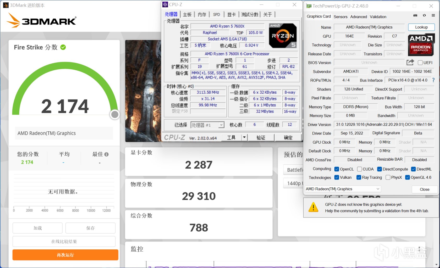 RDNA 2架構核顯,GPU-Z目前還不能識別,Ryzen 7000全系都是相同規格的核顯,這裏使用的是Ryzen 5 7600X,3DMark Fire Strike顯卡跑分能達到2287,略高於i5 12400搭配DDR4 3600內存的UHD 730,也就是亮機卡的水平。