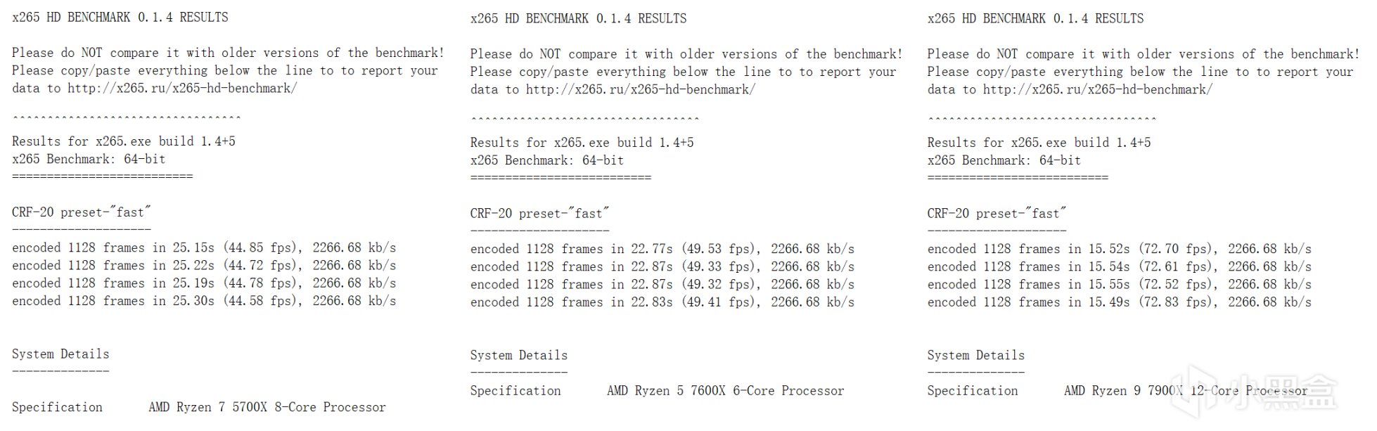 X265 HD編碼測試,雖然只有幾秒鐘的時間優勢,六核心的Ryzen 5 7600X還是能再次領先八核心的Ryzen 7 5700X,而規格更強大的Ryzen 9 7900X對於這種項目來說,核心數和線程數就是優勢。