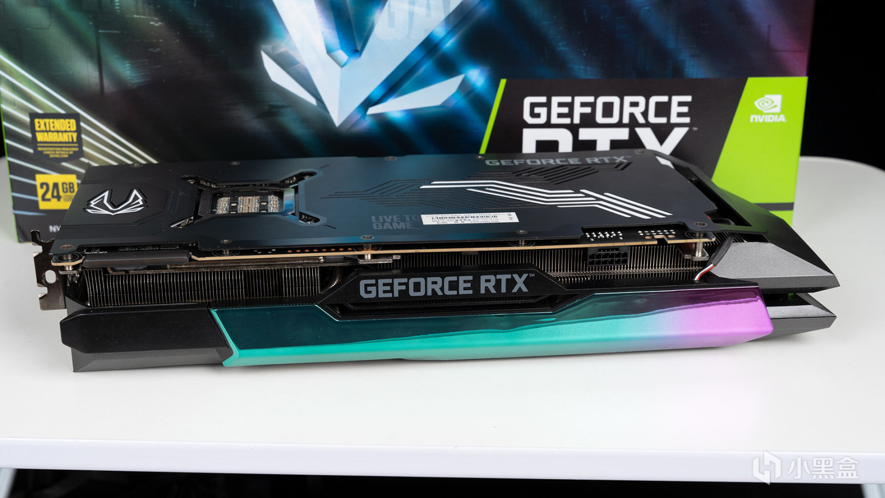 顯卡側面最吸睛的部分,莫過於經過電鍍工藝處理的區域,不亮機的時候,呈現出一種柔美的色彩,亮機以後將會在其表面透射出ARGB燈效。