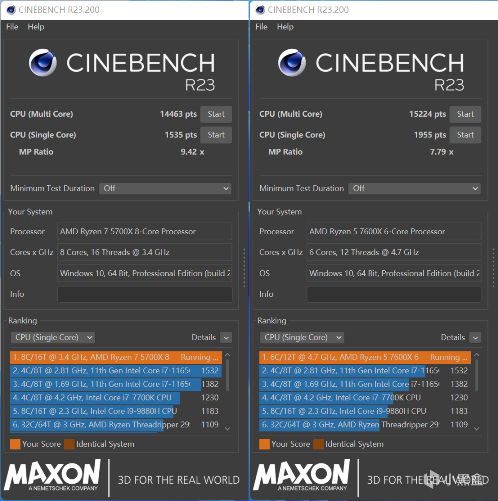 CINEBENCH R23測試,Ryzen 5 7600X單核1955 pts,多核15224 pts,Ryzen 7 5700X單核1535 pts,多核14463 pts