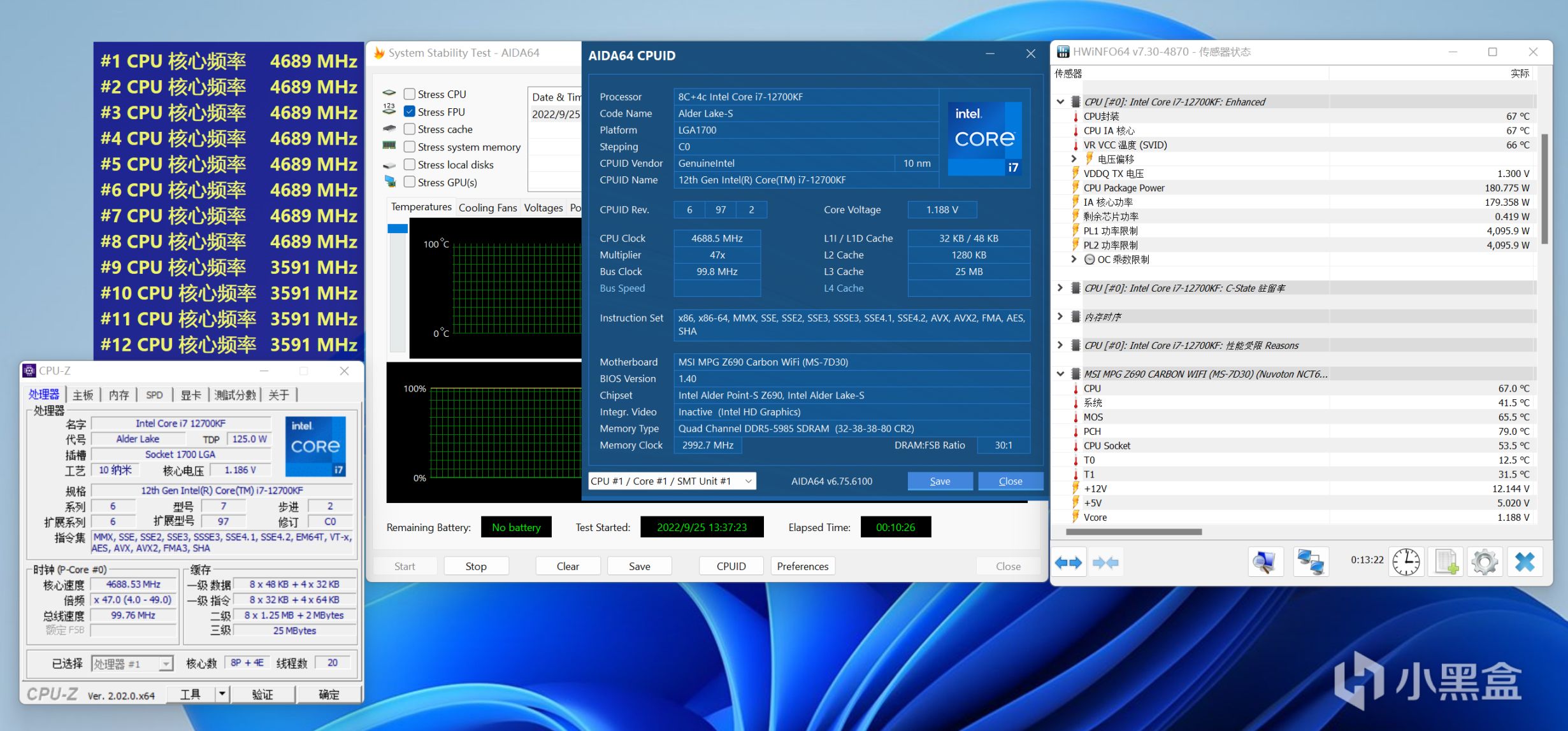 AIDA64單烤FPU項目,Core i7 12700KF的P核心爲4.7Ghz,E核心爲3.6GHz,CPU Package功耗爲180W左右,CPU封裝溫度爲67℃