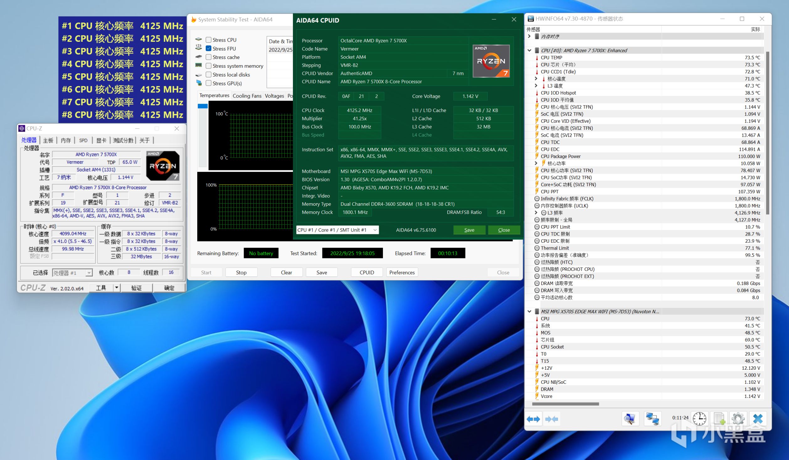 AIDA64單烤FPU項目,Ryzen 7 5700X能夠長時間穩定全核4.12GHz,CPU Package功耗爲110W左右,CPU封裝溫度爲73.5℃