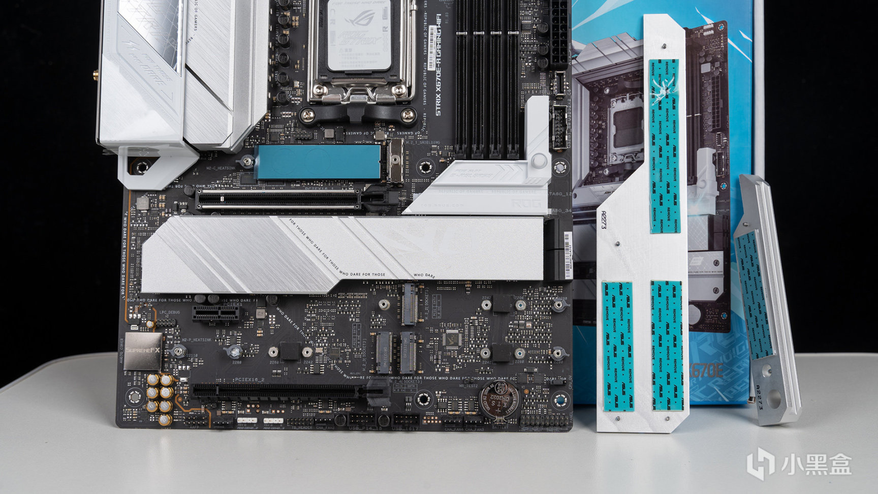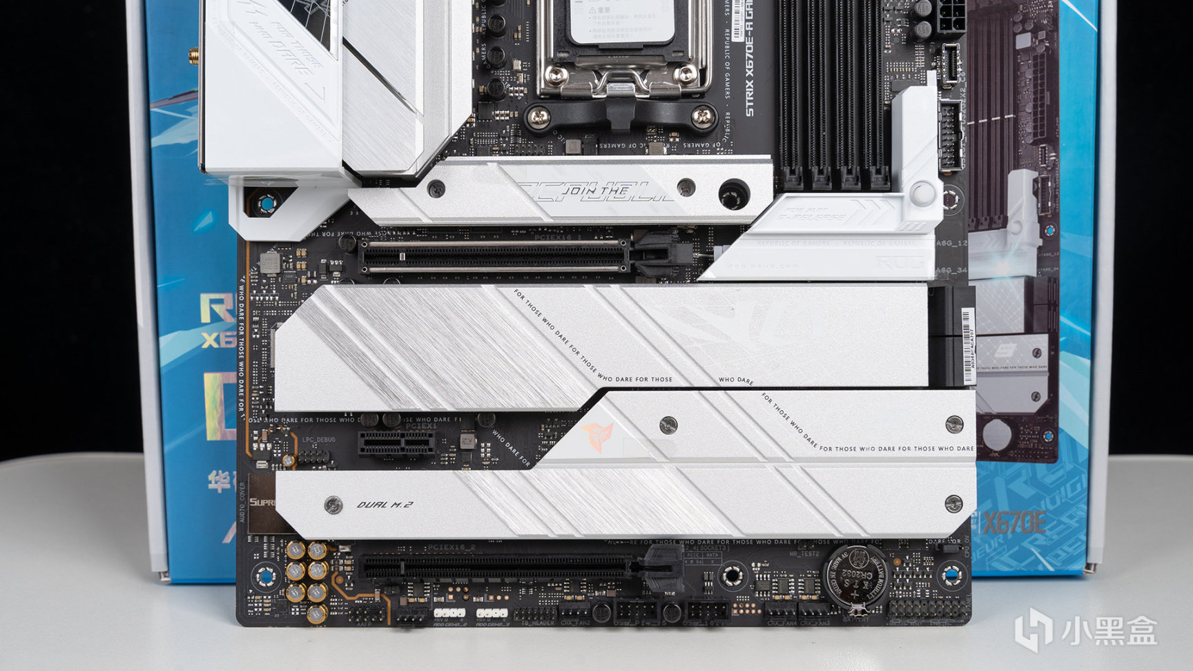 ROG X670E吹雪擁有四組M.2插槽,其中上面兩組最高支持PCIe 5.0X4(第一組的散熱馬甲是多層設計的),剩下兩組是由X670芯片組提供的PCIe 4.0X4,分配挺合理,未來平臺升級潛力很強,每組M.2插槽都標配便捷式M.2安裝卡扣。