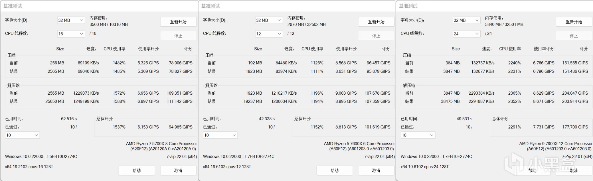7-ZIP解壓縮測試,Ryzen 5 7600X在壓縮性能方面要領先於Ryzen 7 5700X,解壓縮性能兩者基本差距不大,除了CPU性能以外,其實DDR5內存對於這種項目幫助也很大,Ryzen 9 7900X的壓縮和解壓縮性能基本是Ryzen 5 7600X的兩倍。