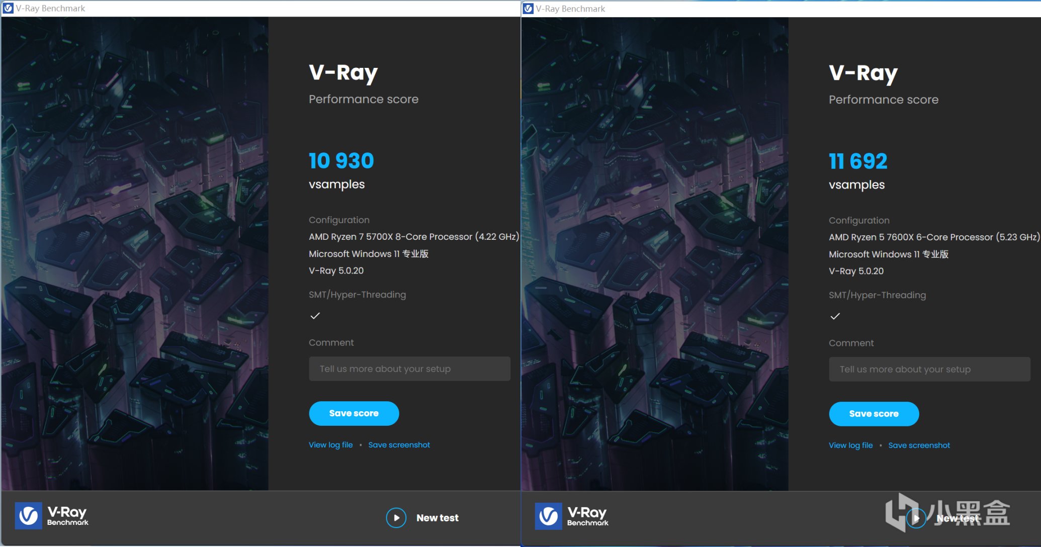 V-RAY渲染測試,Ryzen 5 7600X得分11692,Ryzen 7 5700X得分10930