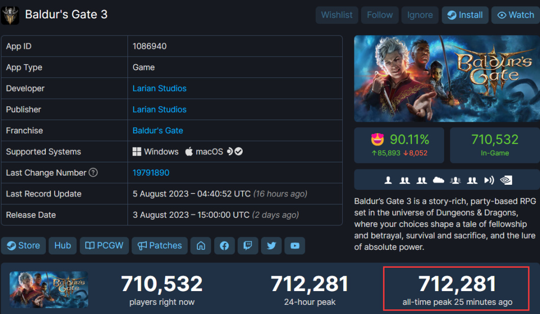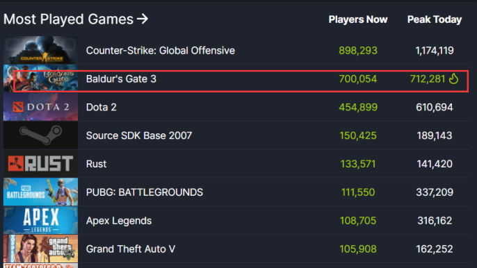 《博德之门 3》正式版于 2023 年 8 月 3 日 在 Steam 平台上发售,而 PS5 版本则将于 2023 年 9 月 6 日 发售,目前该游戏在 Steam 平台已突破 71 万在线玩家峰值,成为 Steam 平台第二名最热的游戏: