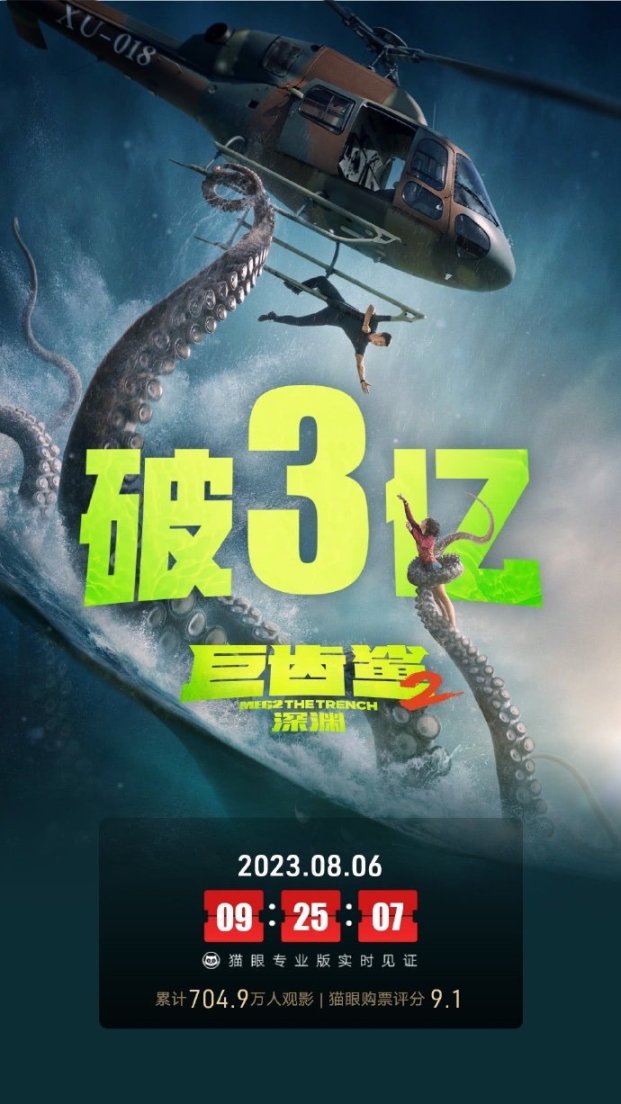 根据第三方数据平台猫眼专业版的数据显示:由杰森·斯坦森、吴京等主演的动作电影《巨齿鲨2:深渊》上映第3天,中国内地票房突破3亿元!