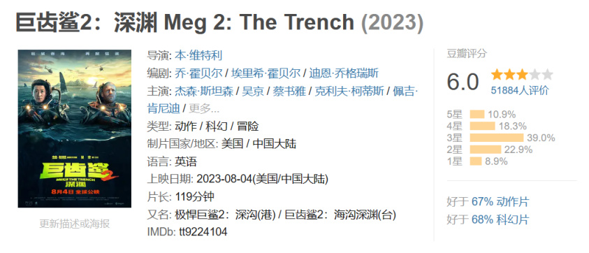 目前,电影《巨齿鲨2:深渊》在国内知名评分网站豆瓣上的评分现已出炉,截至发稿时共有51884名豆瓣用户参与评分,得出的评分为6.0分,好于67%的动作片和68%的科幻片