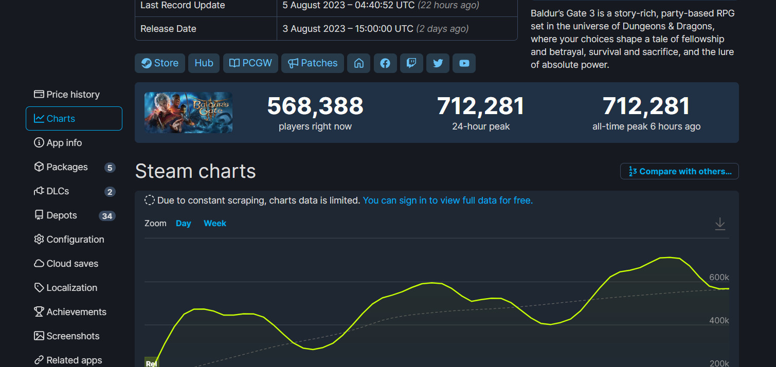 然而,《博德之門3》的入圍也意味着Steam“遊玩人數最多遊戲”的最低標準被抬高,至少需要超過70萬在線玩家。