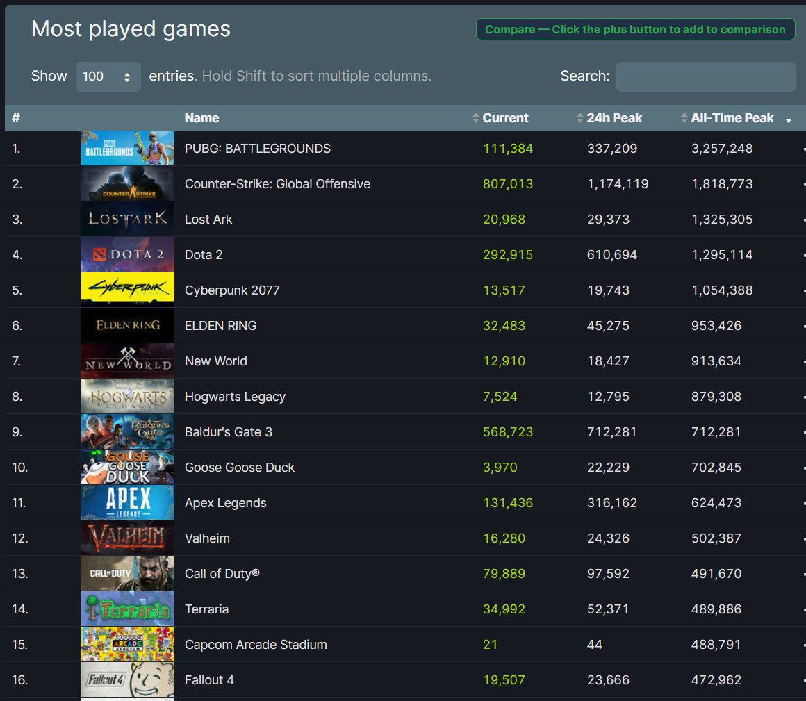 新入圍的《博德之門3》超過了原本位列第九的《鵝鴨殺》,而《Apex英雄》則被擠出Top 10,位列第十一名。第九名的《博德之門3》和第十名的《鵝鴨殺》最高在線人數相差不大,前者爲71萬2281人,後者爲70萬2845人。不過第十一名的《Apex英雄》相對有些差距,其最高在線人數爲62萬4473人。