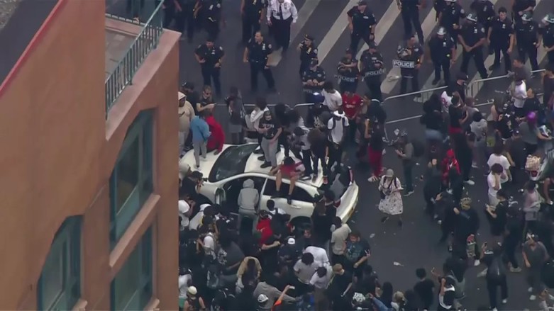 由於活動的突然取消,讓衆多年輕人不憤,然後場面就徹底失控了,有人起鬨Cenat,然後一羣人接着接着就打起來了,甚至有人去踩砸路邊停靠車輛,並在車上跳踢踏舞當Raper。
