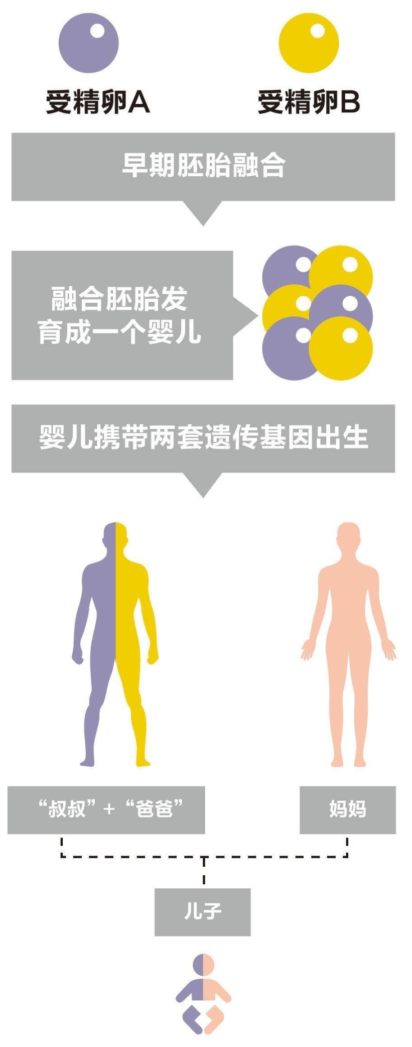 說來也是好笑,上面所講到的極特殊情況,又有誰會想到天底下竟有“我生的孩子不是我的”這種事情?雖然概率幾乎爲0,但這種事情也應當引起人們一定程度上的關注,至於倫理學上辯論或者討論的話,同樣的,我還是給大家直接點明結果就可以了:特殊嵌合體女性如果嵌合的是自己“妹妹”,那麼和自己社會意義上的丈夫生下的就是自己的“外甥\外甥女”;特殊嵌合體男性如果嵌合的是自己的“哥哥”,那生下的就是自己的“侄子\侄女”,直接類比真實存在這樣一個人就可以了。