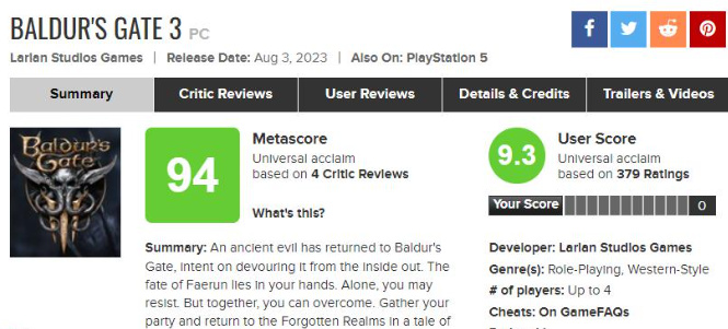 遊戲目前發售三天,M 站媒體均分 94 分,玩家均分 9.3 分。